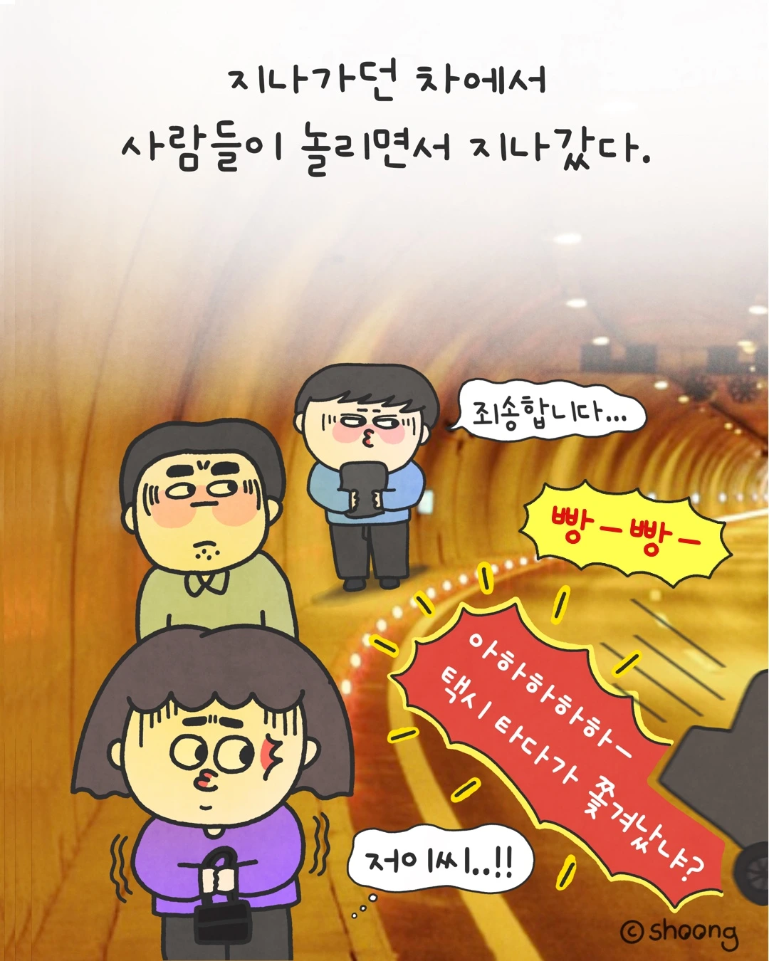 굴다리를 아직도 못 벗어나고 걷고 있는데 누군가 빵빵 거리면서 비상등을 켜고 나를 부르는 것이었다.