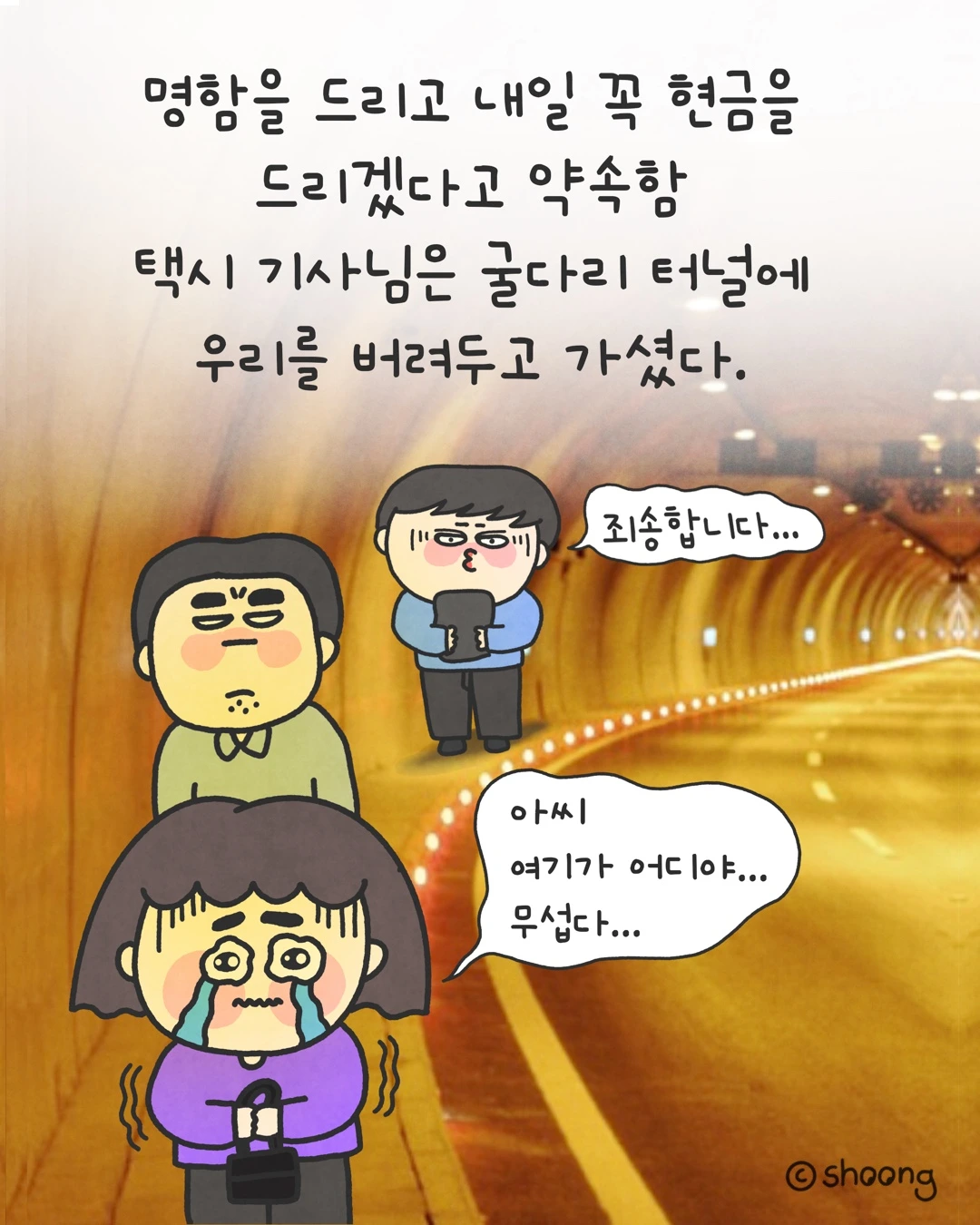 나도 지금 짜증 나고, 이 새벽에 뭐 하고 있나 싶고, 집에 빨리 가고 싶은데 돈 안 들고 다닌 다고 내가 왜 욕을 먹고 있어야 하지?‘ 참을 인을 꾸역 구역 새기며 나는 택시 기사님에게 명함을 드리며 현금을 안 들고 다녀서 죄송하다며 내일 꼭 저 진상 동료와 다시 찾아뵙고 세탁비를 드린다고 약속을 하고 보내 드렸다.