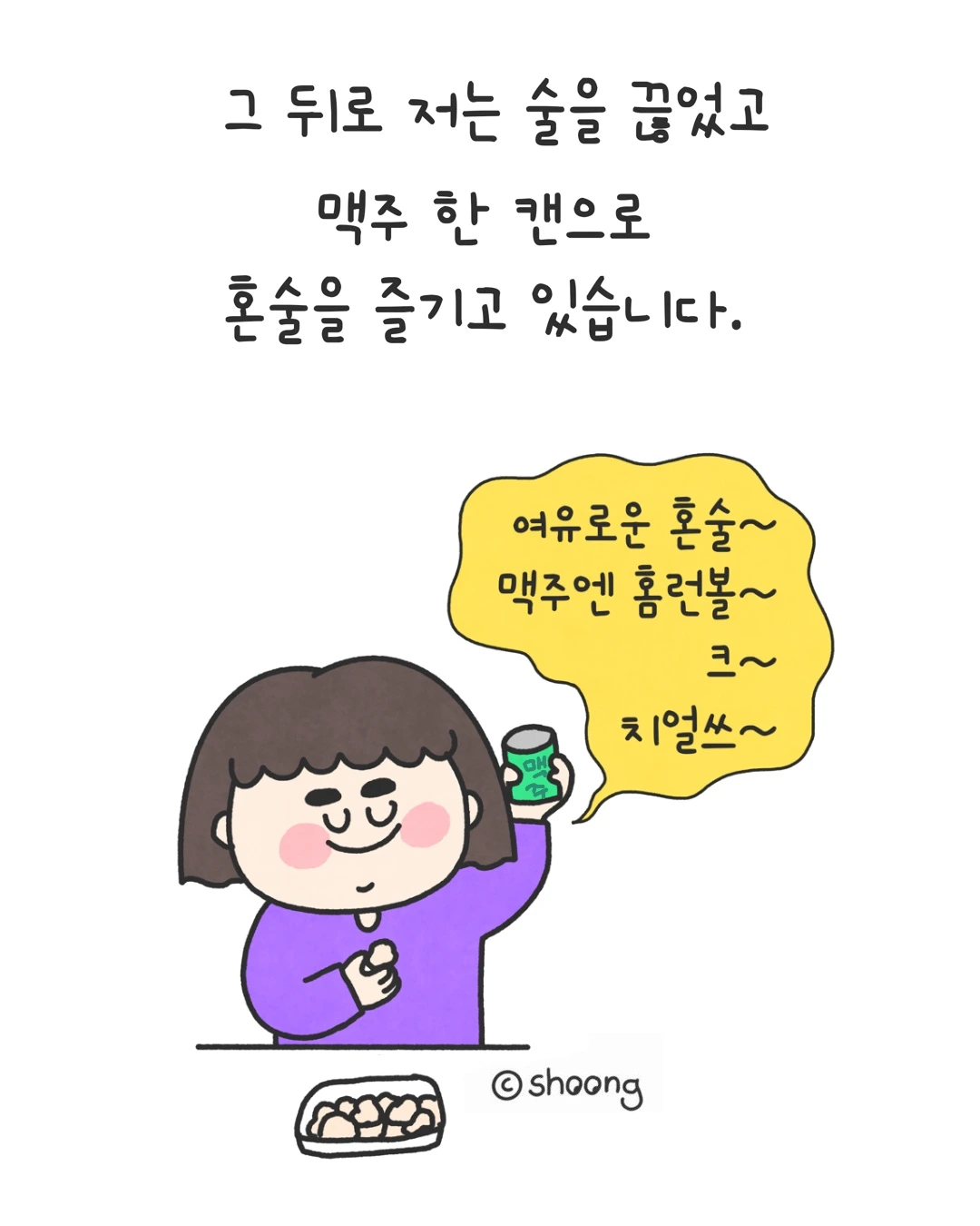 술 먹고 누구 데려다줄 걱정 안 해도 되고, 시끄럽고 사람 북적대는 곳에서 이상한 술주정에 호응하지 않아도 되는 오롯이 나 혼자만 즐길 수 있는 혼술.