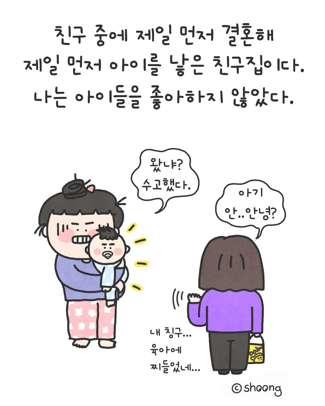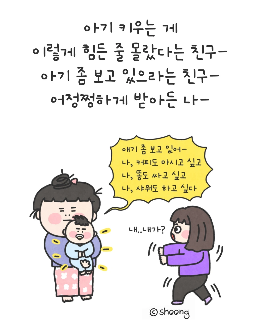 육아에 지쳐 제대로 씻지도 못하고 먹지도 못한 친구가 짠해 보였다. 친구랑 얘기를 나누다가 갑자기 친구가 벌떡 일어니더니 아기 좀 보고 있으라면서 나에게 넘겨주는 게 아닌가?