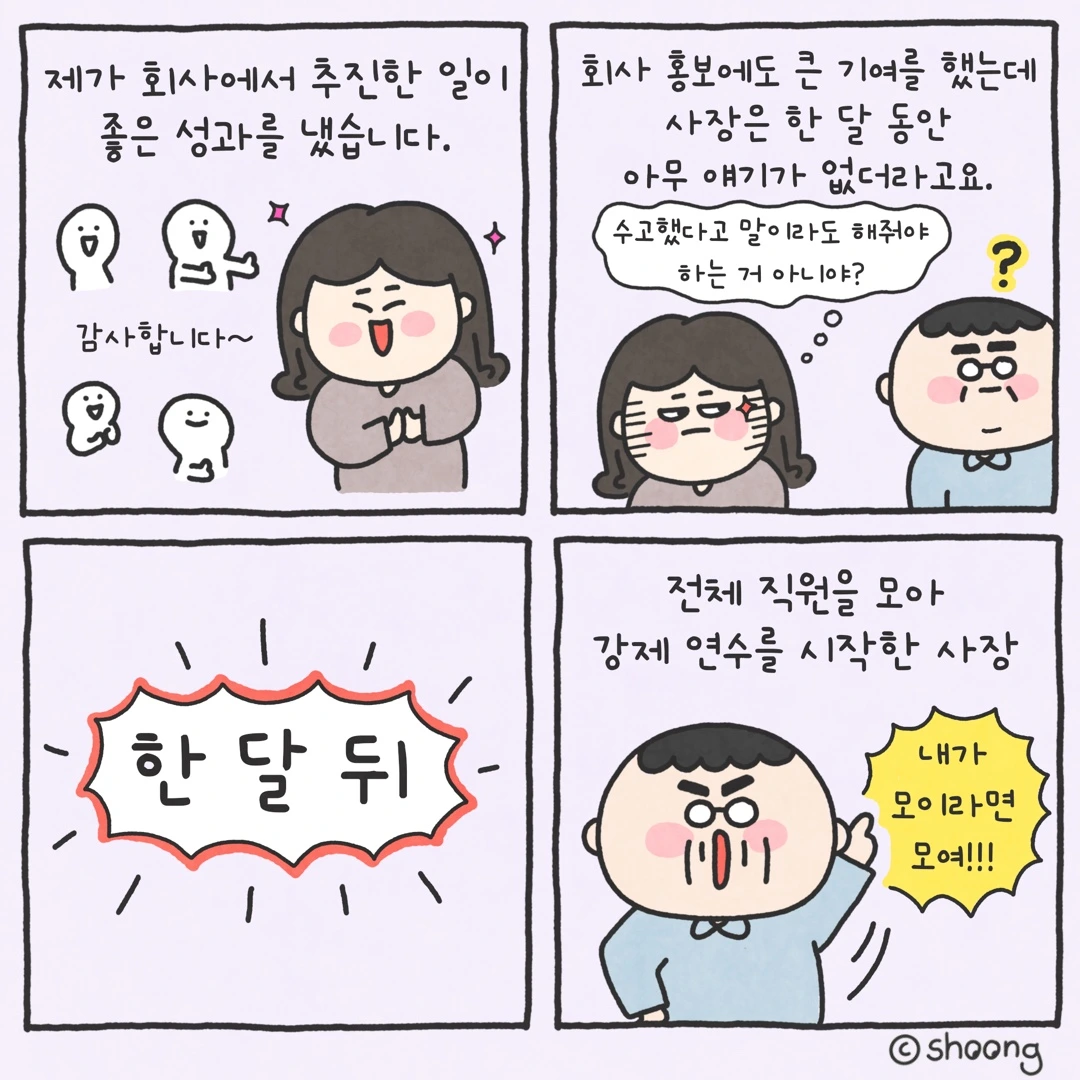 그런데 한 달이 넘게 지난 어느 날 갑자기 특별한 이유도 없이 전체 직원을 모아 강제 연수를 시작하더니 몇 시간 동안 또 자기 자랑만 실컷 늘어놓더라고요.