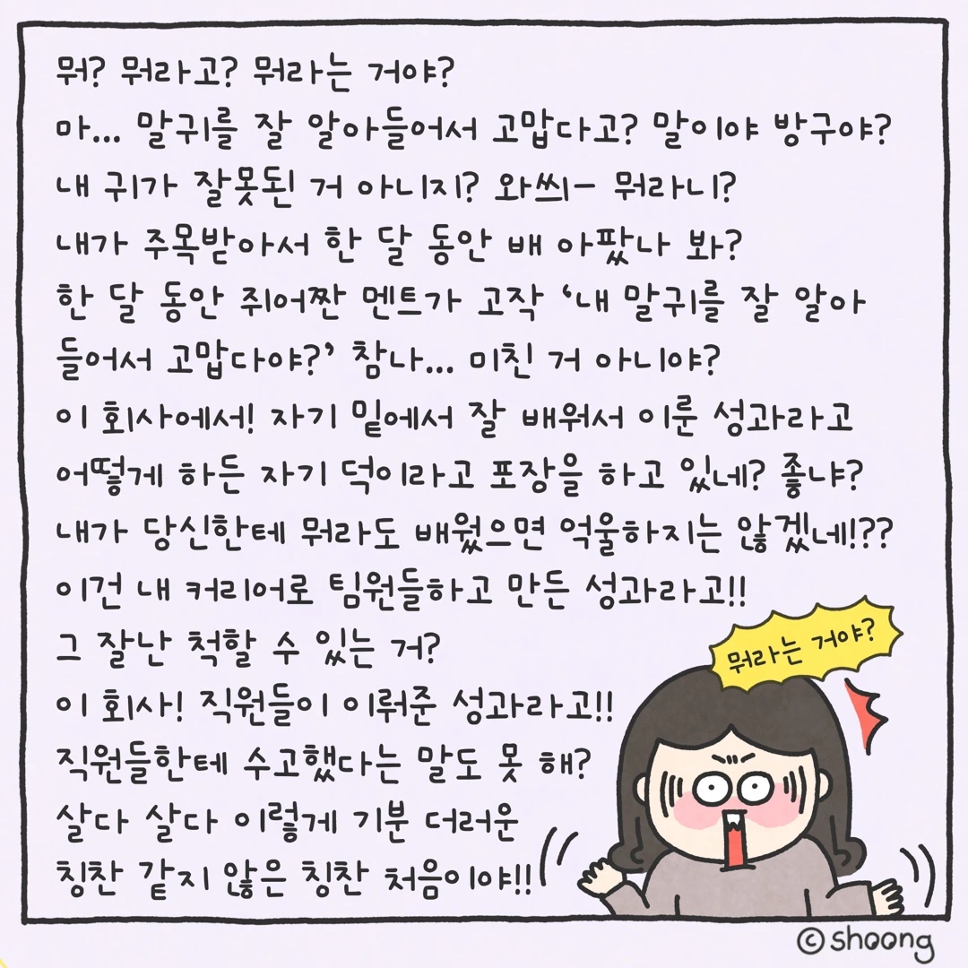 진심으로, 제가 태어나서 들은 칭찬의 멘트 중 최악의 멘트였어요. 듣고 열받는 칭찬은 난생처음이었다는 사연이었습니다.