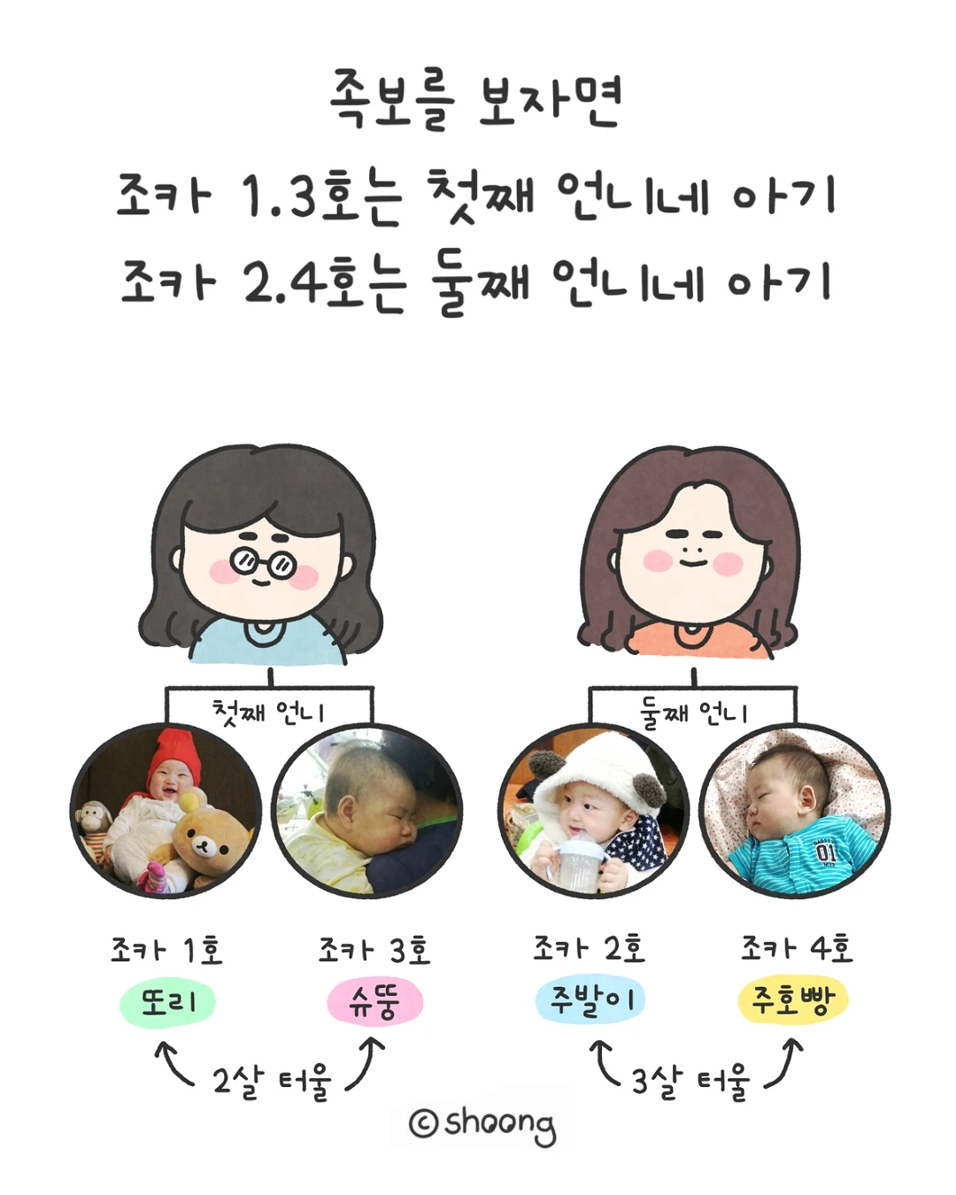 태어난 순으로 조카 1,2,3,4호라 부른다.
