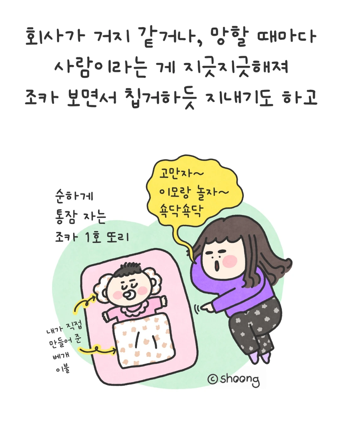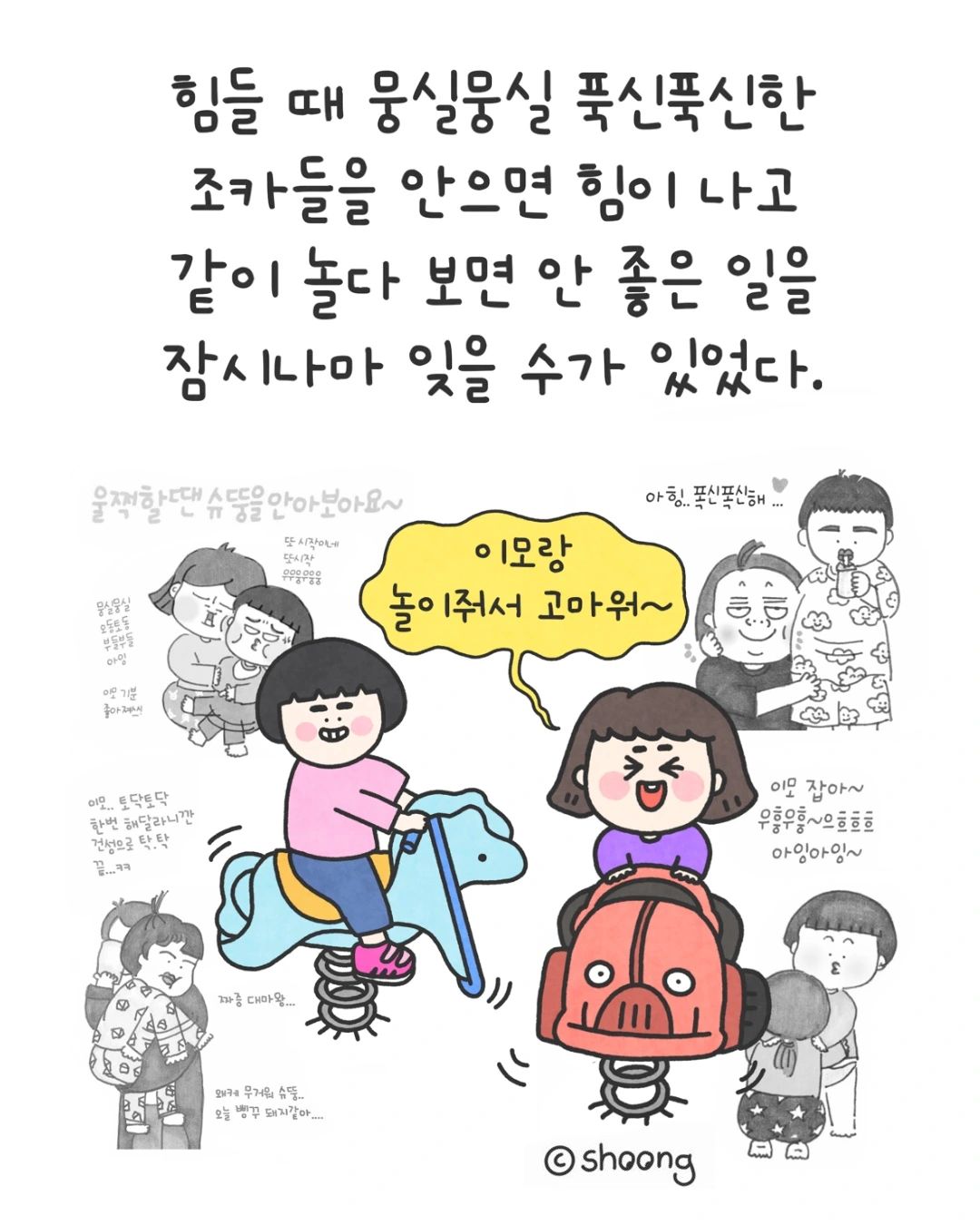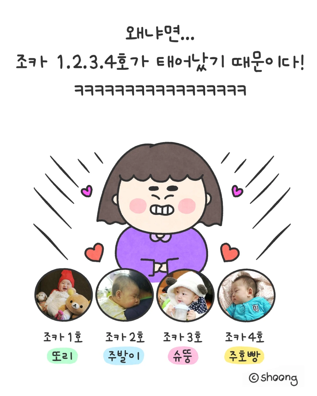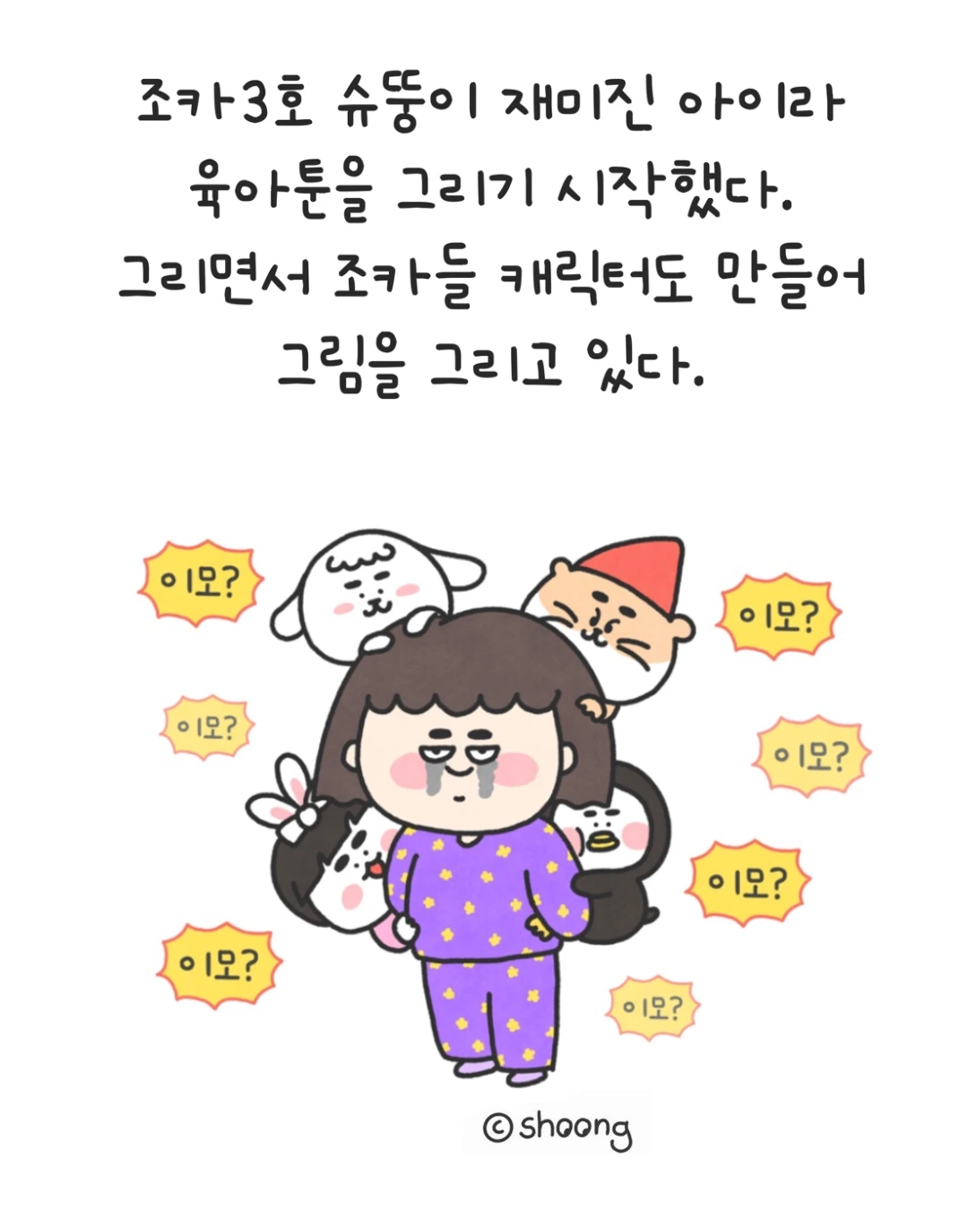 조카들을 키우면서 재미있는 일들이 많이 생겨 혼자 알고 있기는 아까워 다른 사람들에게도 조카들을 알려주고 싶어 육아툰을 그리기 시작했다.