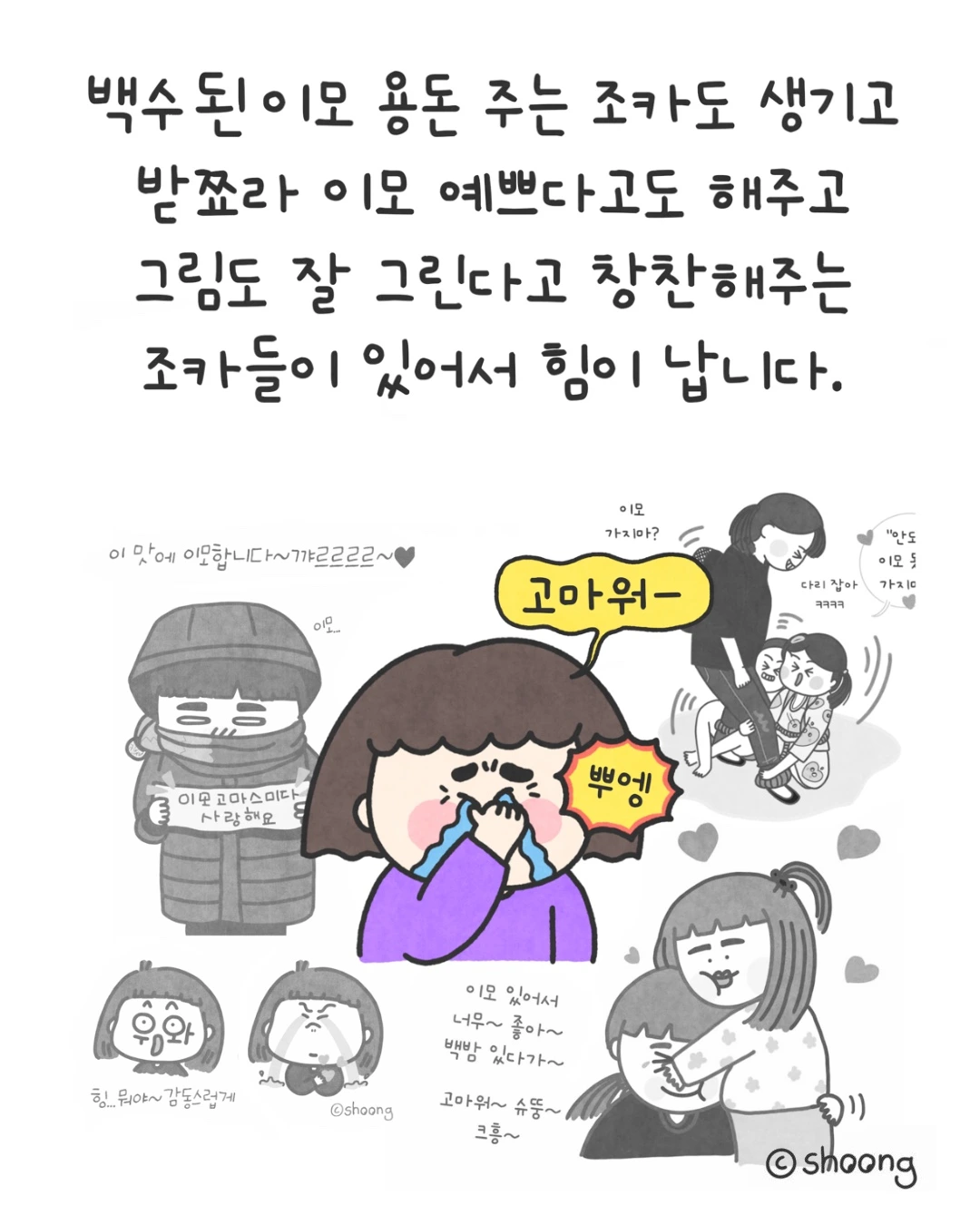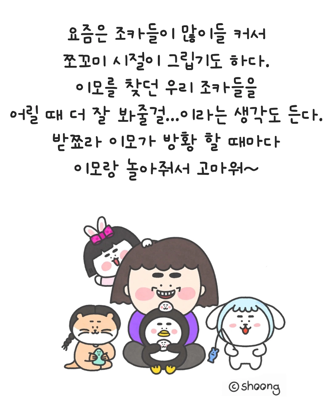 조카들이 클 때까지 그림만 그리고 초등학교에 들어가서는 사생활 보호를 위해 조카들 캐릭터를 만들어 그리고 있다.