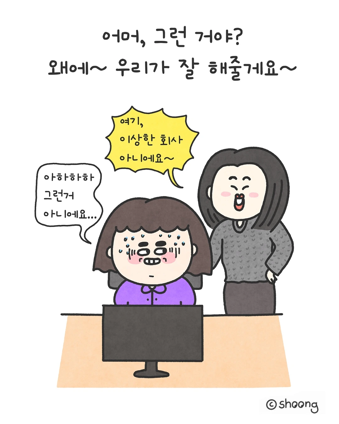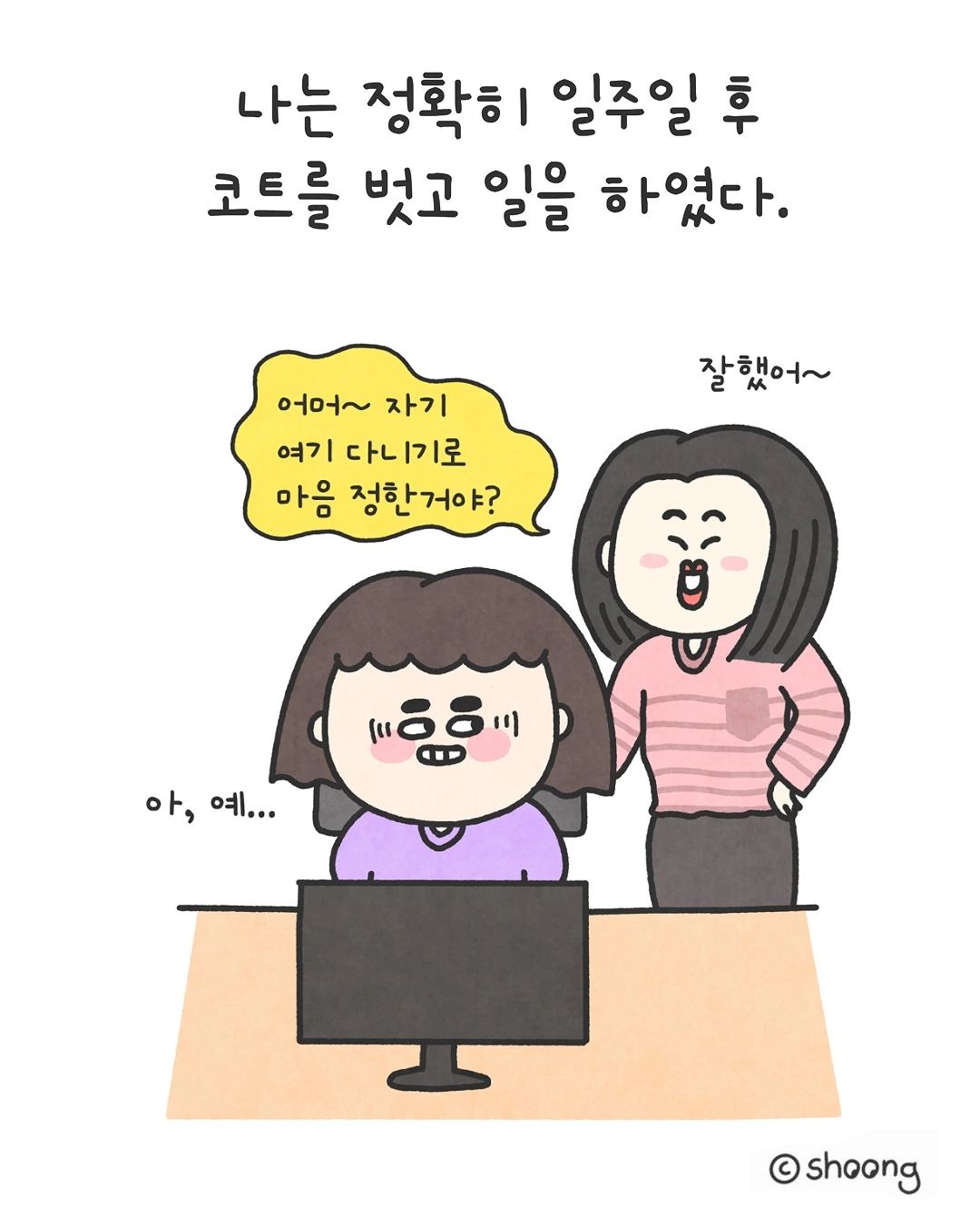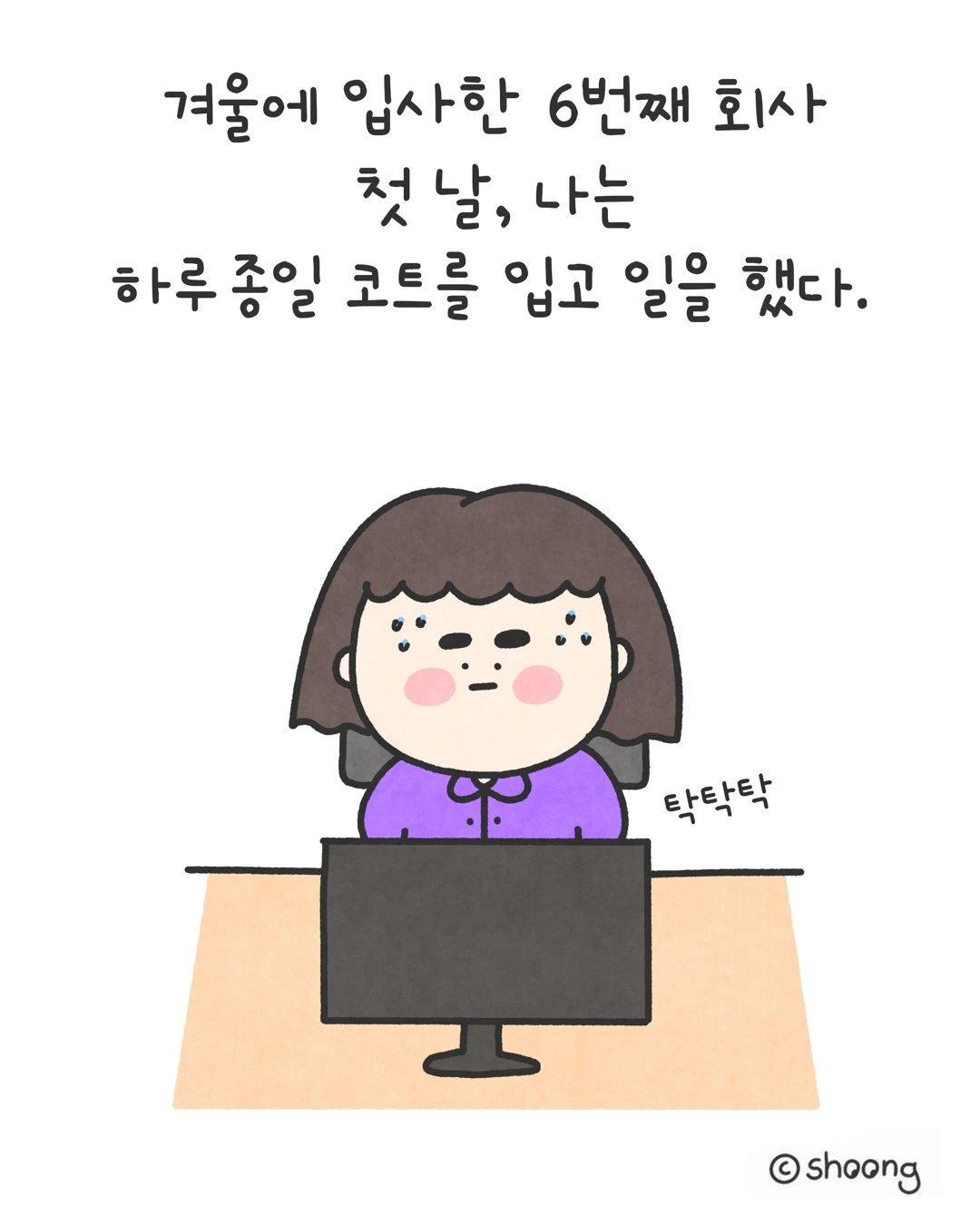히터를 엄청 빵빵하게 틀어줘 사무실은 덥다 못해 숨이 막힐 지경이었다. 그러나 나는 입사한 첫날 코트를 벗지 않고 일을 했다.