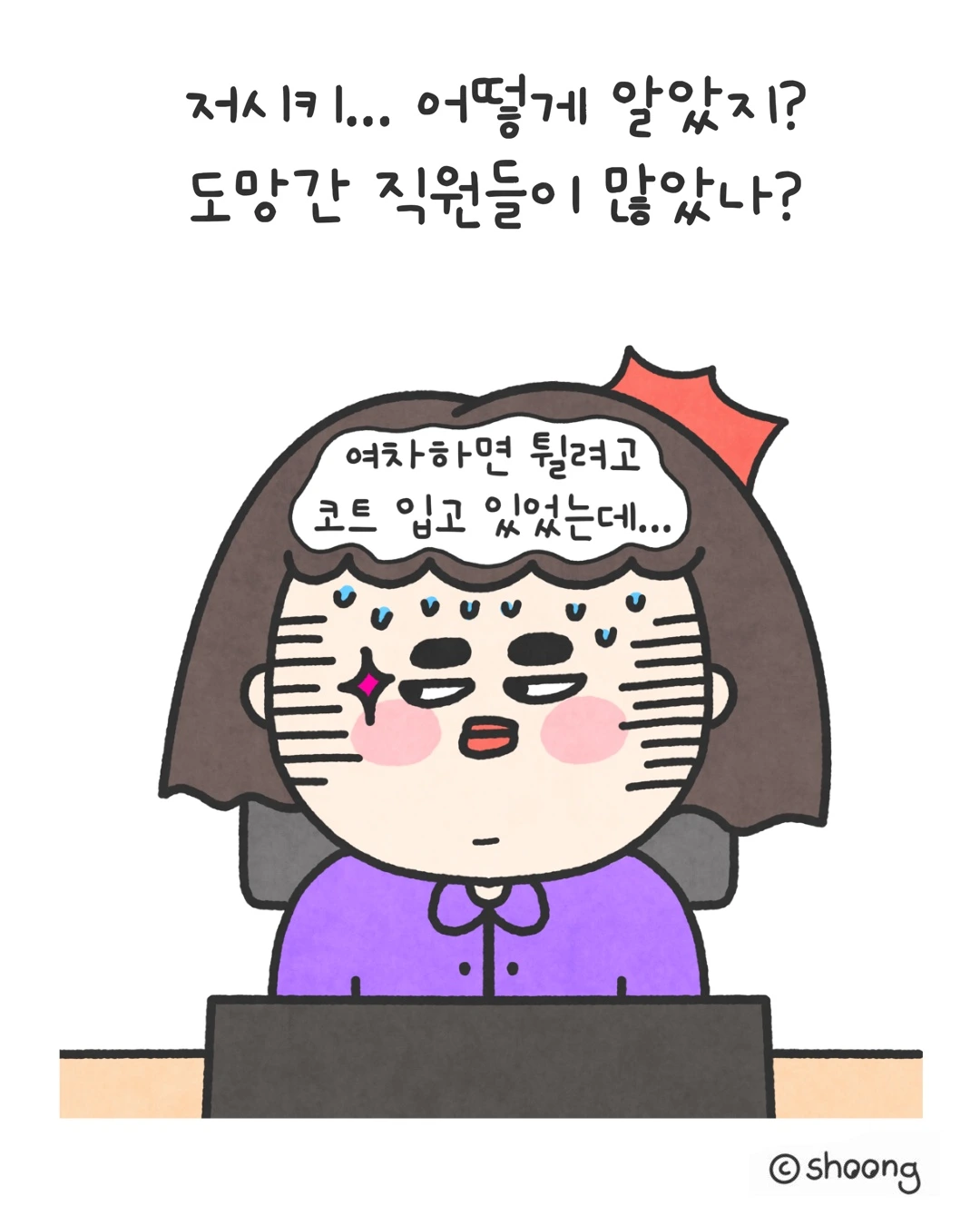 코트를 벗은 내 모습을 보고 팀장이 놀라 다가온다