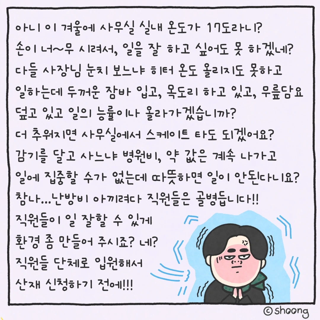 사장님, 직원들이 일을 잘하고 싶어도 못 하겠네요~ 직원들 모두 다~ 병원에 입원해서 산재 신청 하기 전에 사무실 적정 온도 좀 올려주세요-