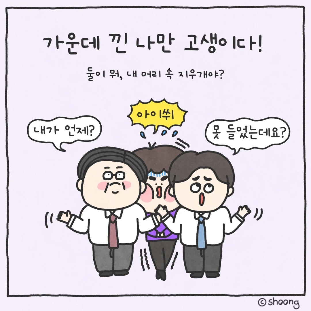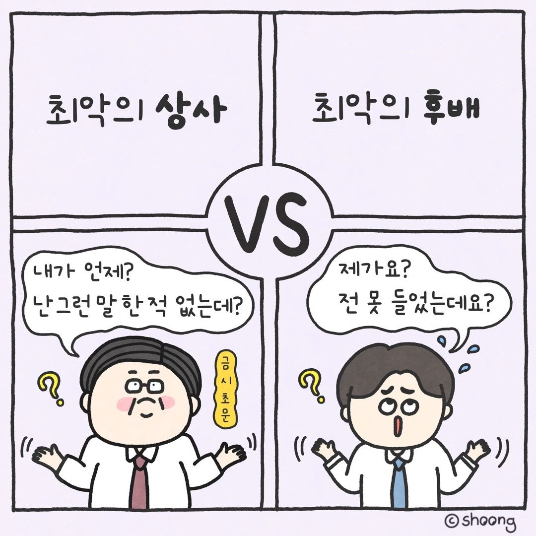 “제가요? 전 못 들었는데요?”라고 말하며 발뺌하는 오리발 후배