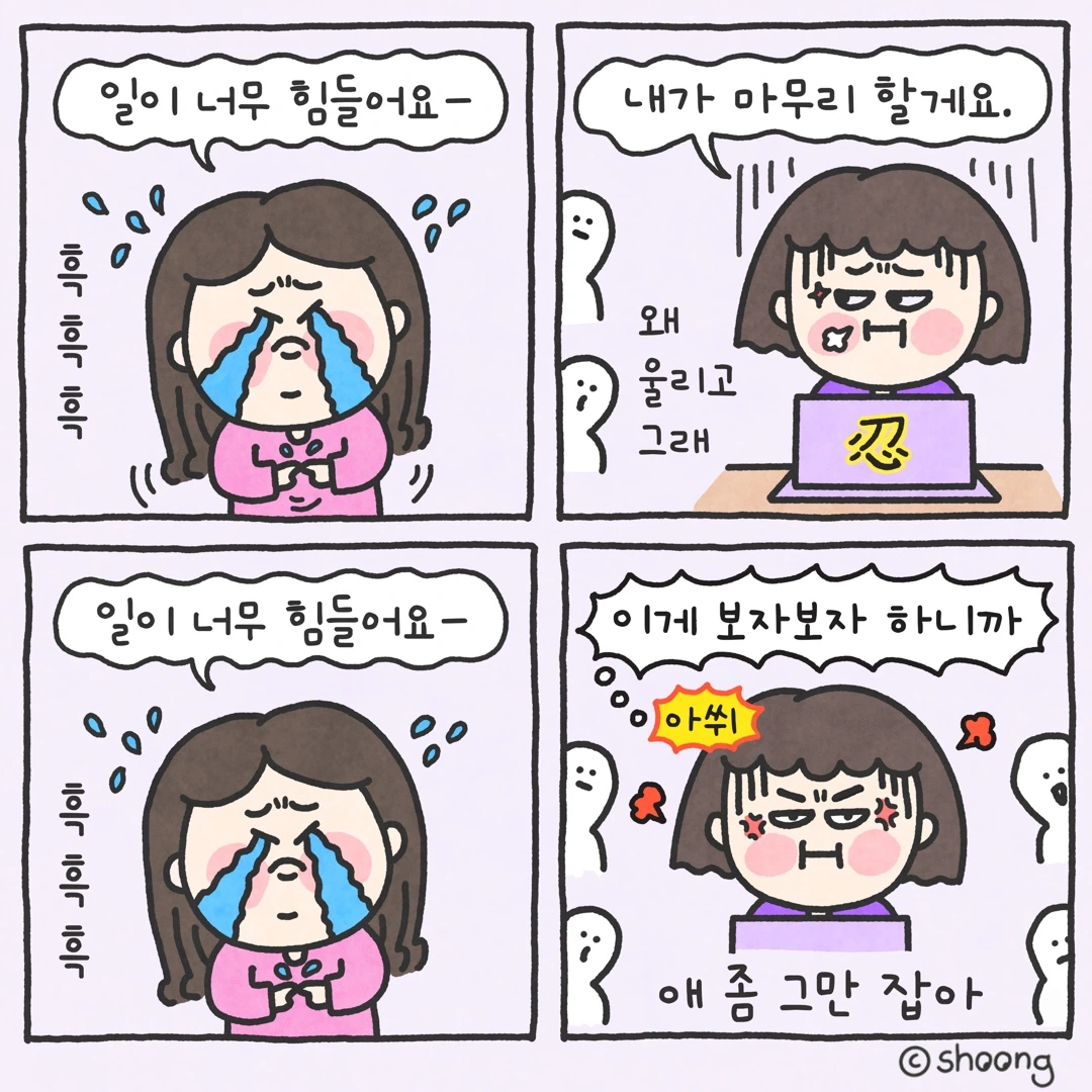 일이 어렵다고 울고, 힘들다고 매일 웁니다.