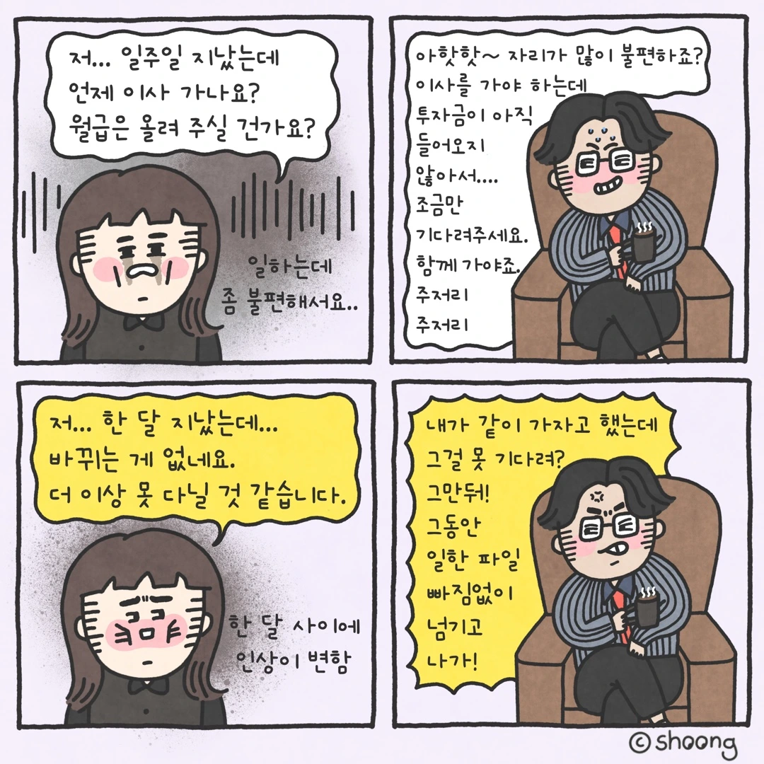 일주일이 지나도 이사 갈 기미는 보이지 않았고 사장은 투자금이 들어올 거라면서 계속 저와 함께하고 싶다면서 이사할 곳 사진을 보여주고, 본인의 성공담 얘기를 또 주저리 주저리 하더라고요.