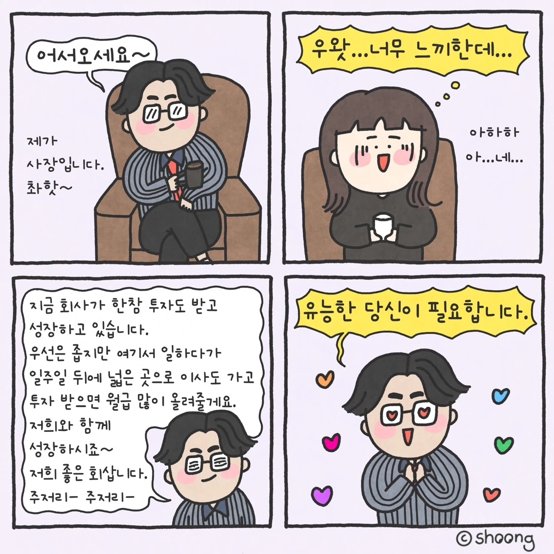 사장은 회사가 투자를 받으면서 커가는 과정이고 이 과정에서 제가 꼭 필요하다며 저와 일을 하고 싶다고 적극적으로 말을 하더라고요.