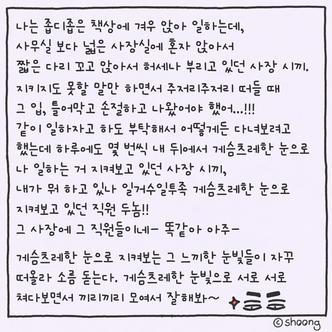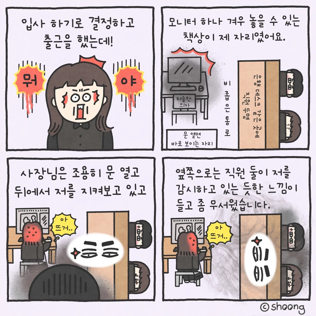 저는 비좁은 자리에 앉아 일을 하면서 뒤로, 옆으로 쳐다보는 시선이 느껴져 신경 쇠약이 걸릴 것 같았어요. 한 달 동안 저런 시선을 느끼며 지내다 보니 실제로 살도 많이 빠졌습니다.
