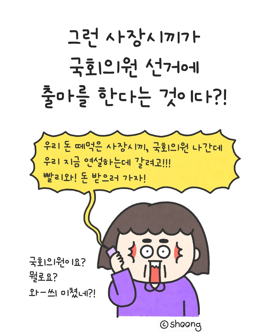 “아니 우리 돈 안 주고 계속 미루는 사장시끼가 국회의원에 출마를 했데.”