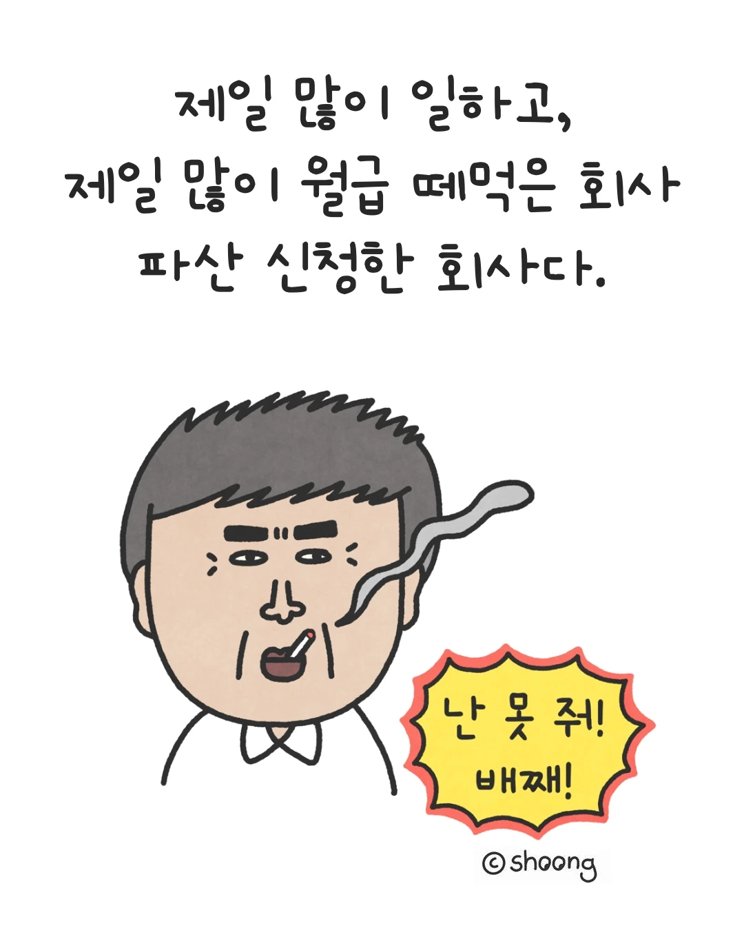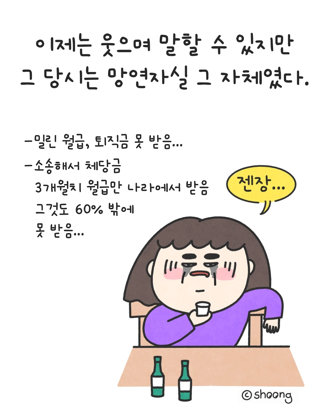 과장님, 팀장님들이 나서서 다 같이 노무사를 만나 고소를 했고, 밀린 월급은 파산 신청을 해버려서 나라에서 주는 체당금 월급 3달치만 받을 수 있었다. 그러나 그것 또한 받을 수 있는 적정 선이 있었고 나는 그 당시 20대라 60% 밖에 받지를 못했다.