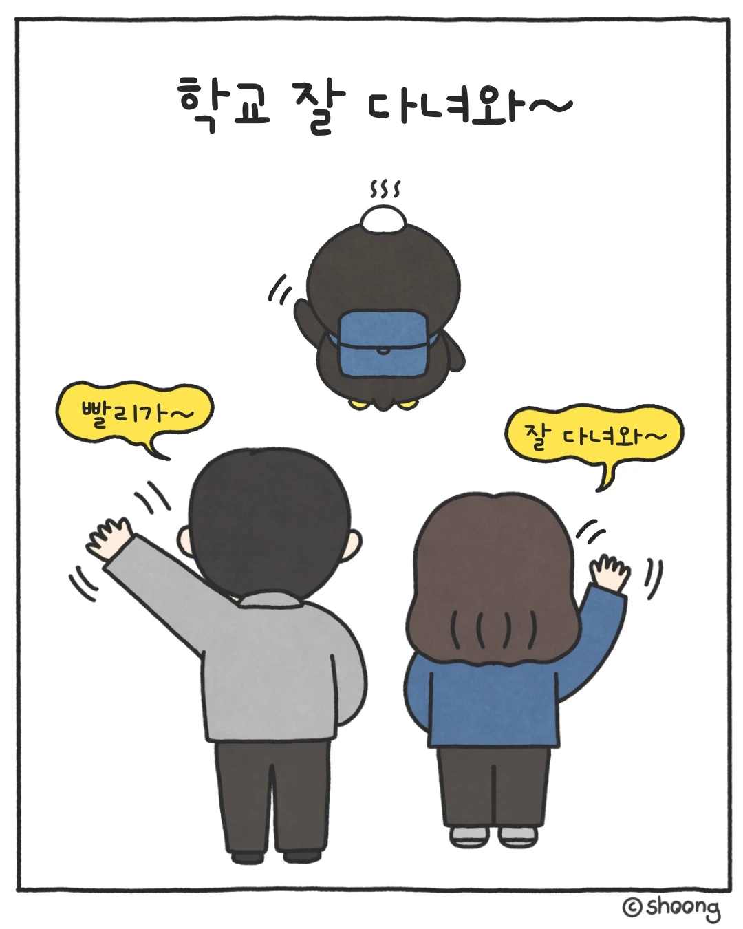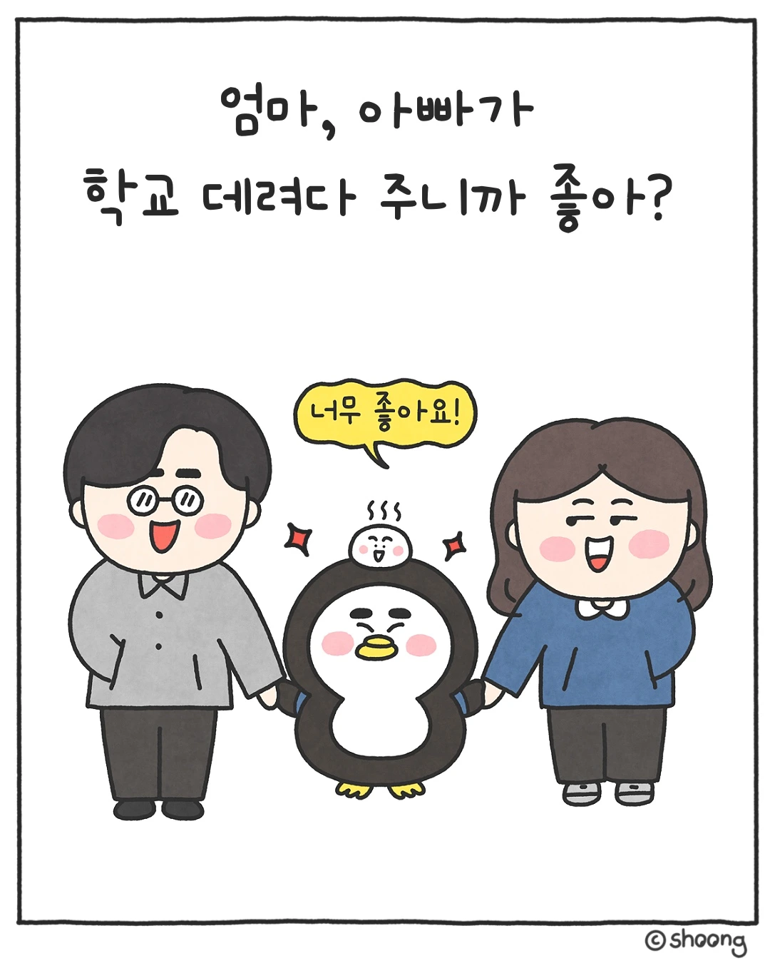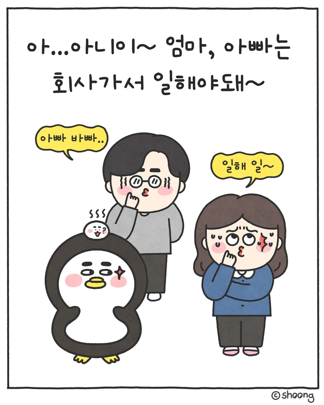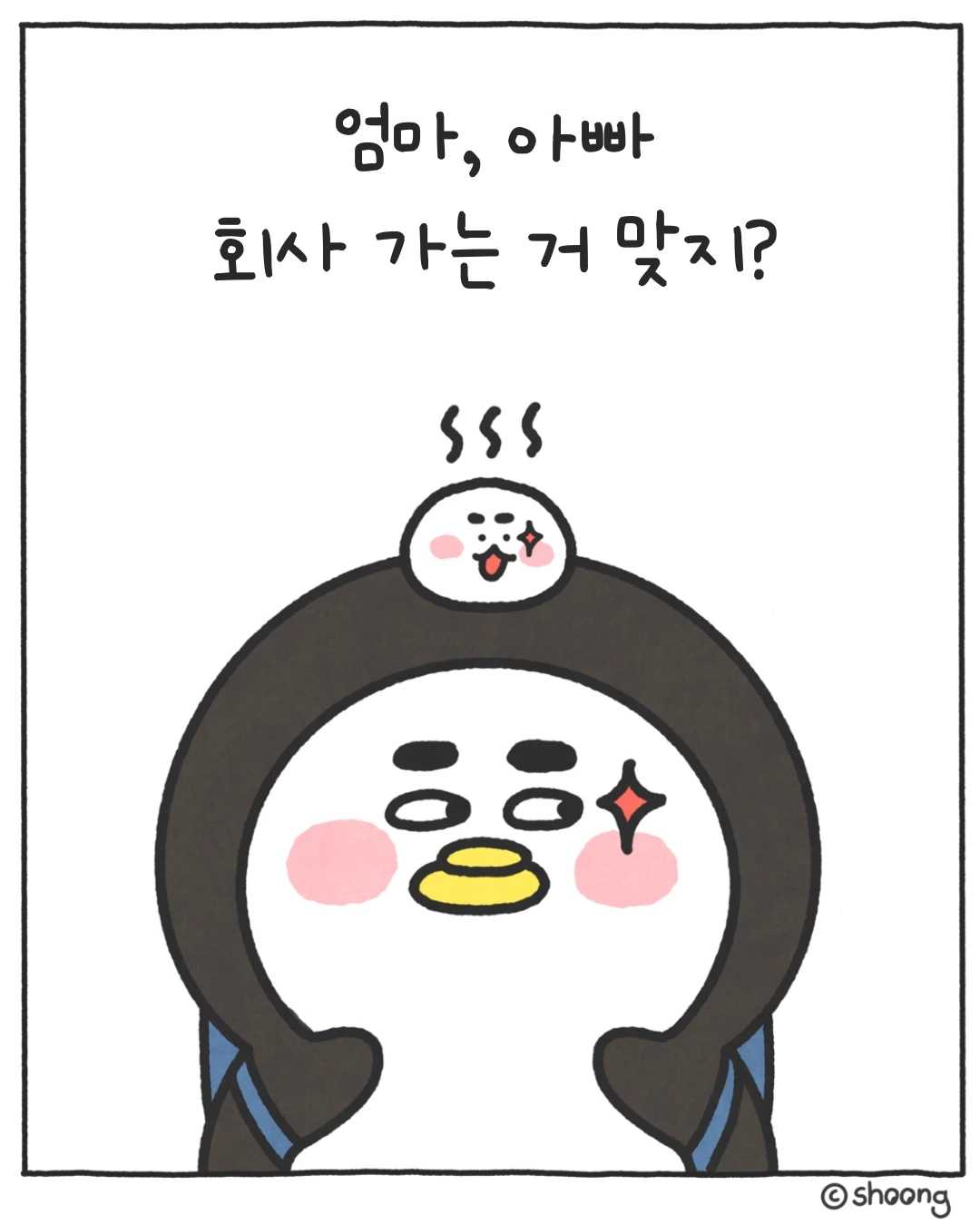 주호빵씨는 나는 학교 가야 하는데 엄마, 아빠는 쉬는지 물어본다.
