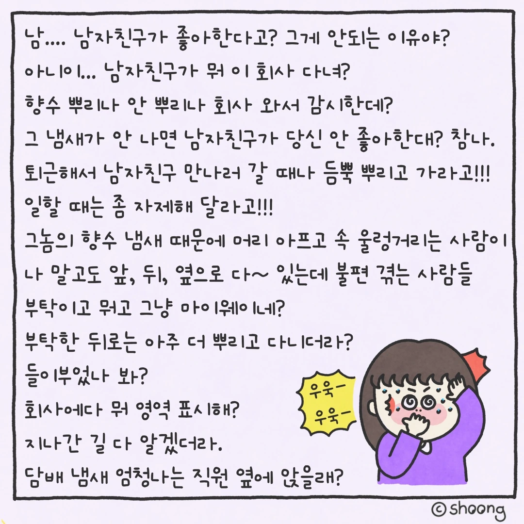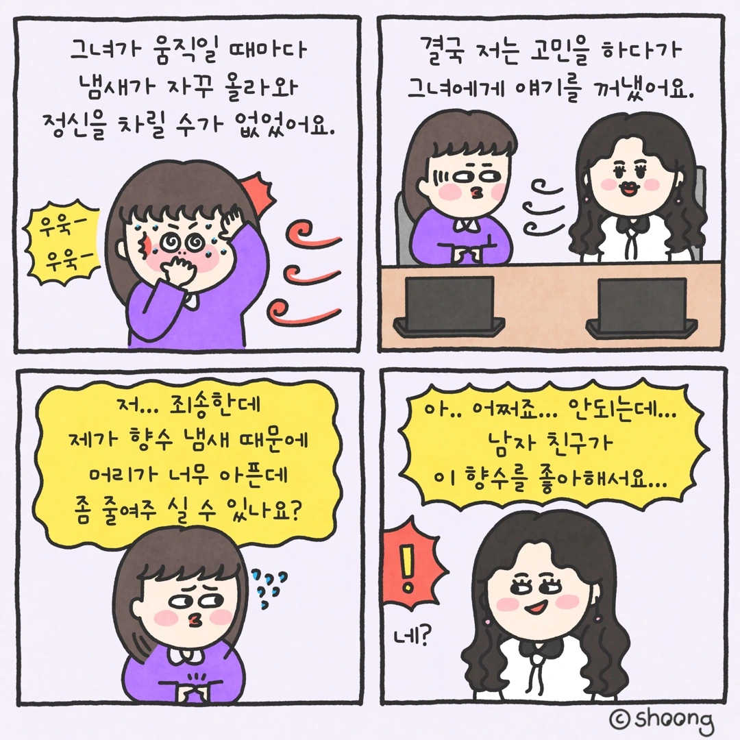 그녀가 움직 일 때마다 향수 냄새가 퍼져 계속해서 머리가 아파오고 밥 먹을 때도 냄새 때문에 밥맛도 떨어지더라고요. 일에 집중을 할 수가 없어 동료들하고 3일 정도 고민을 하다가 말을 해보기로 했어요.