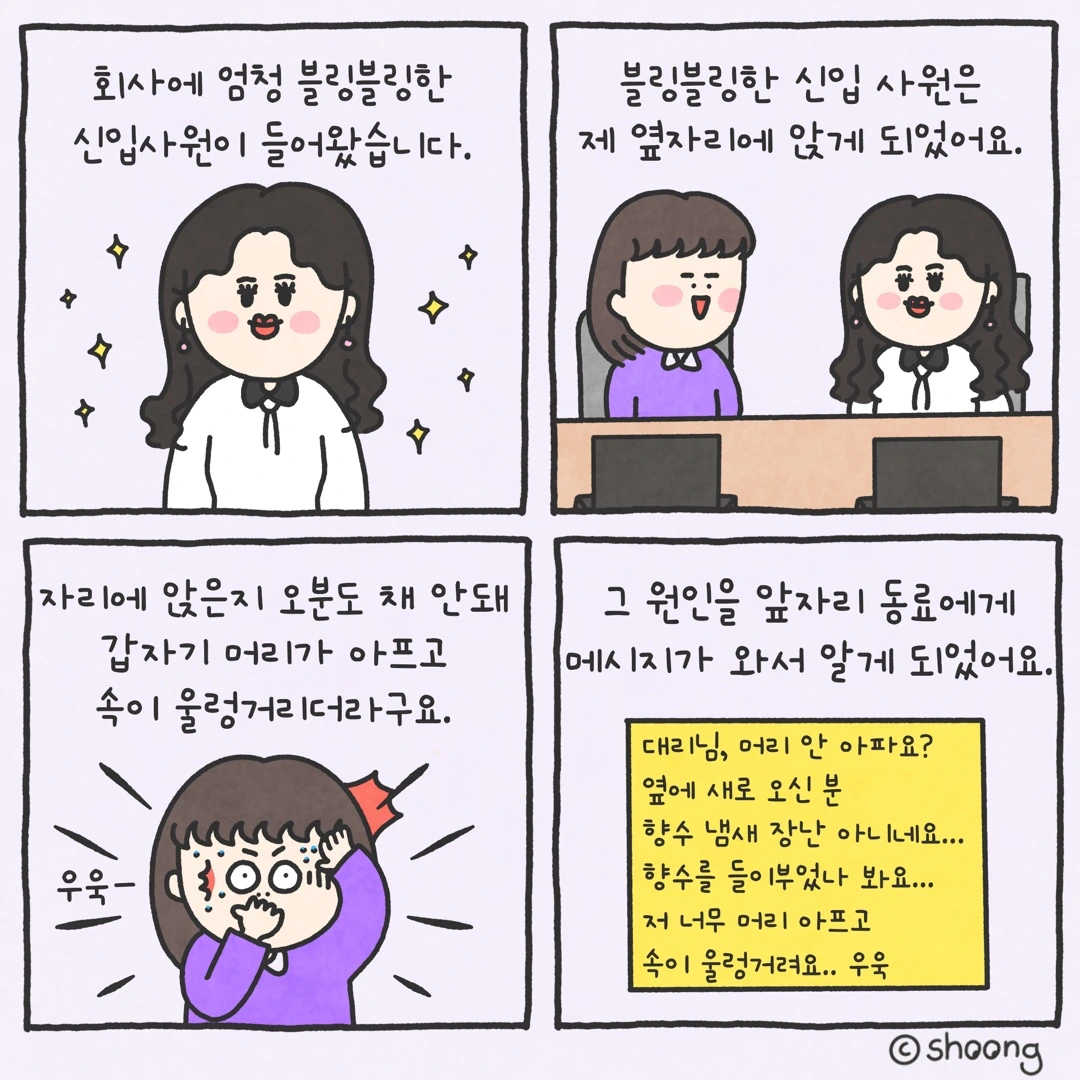 저도 향수를 좋아하고 뿌리고 다니는지라 별생각을 안 했었는데 신입 사원이 자리를 비웠다 들어올 때 향수를 더 뿌리고 오는지 계속 향이 독해지더라고요.