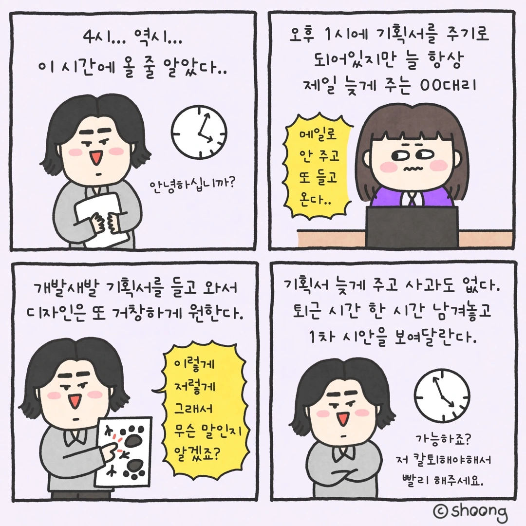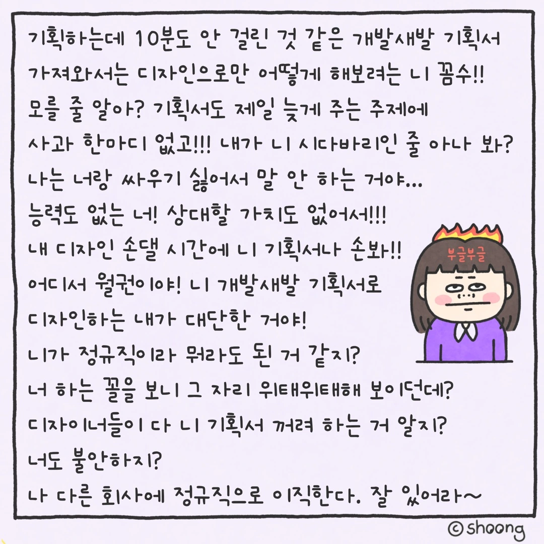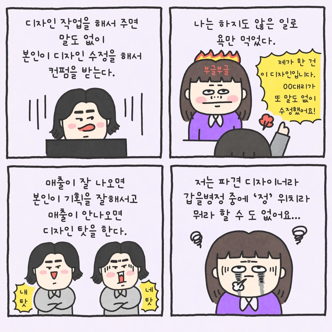 저는 파견직 디자이너라 갑을병정 중에 ‘정’인 입장이라, 뭐라 해봤자 저만 손해인 걸 여러 번 겪은지라... 이제는 그냥 그러려니 합니다.