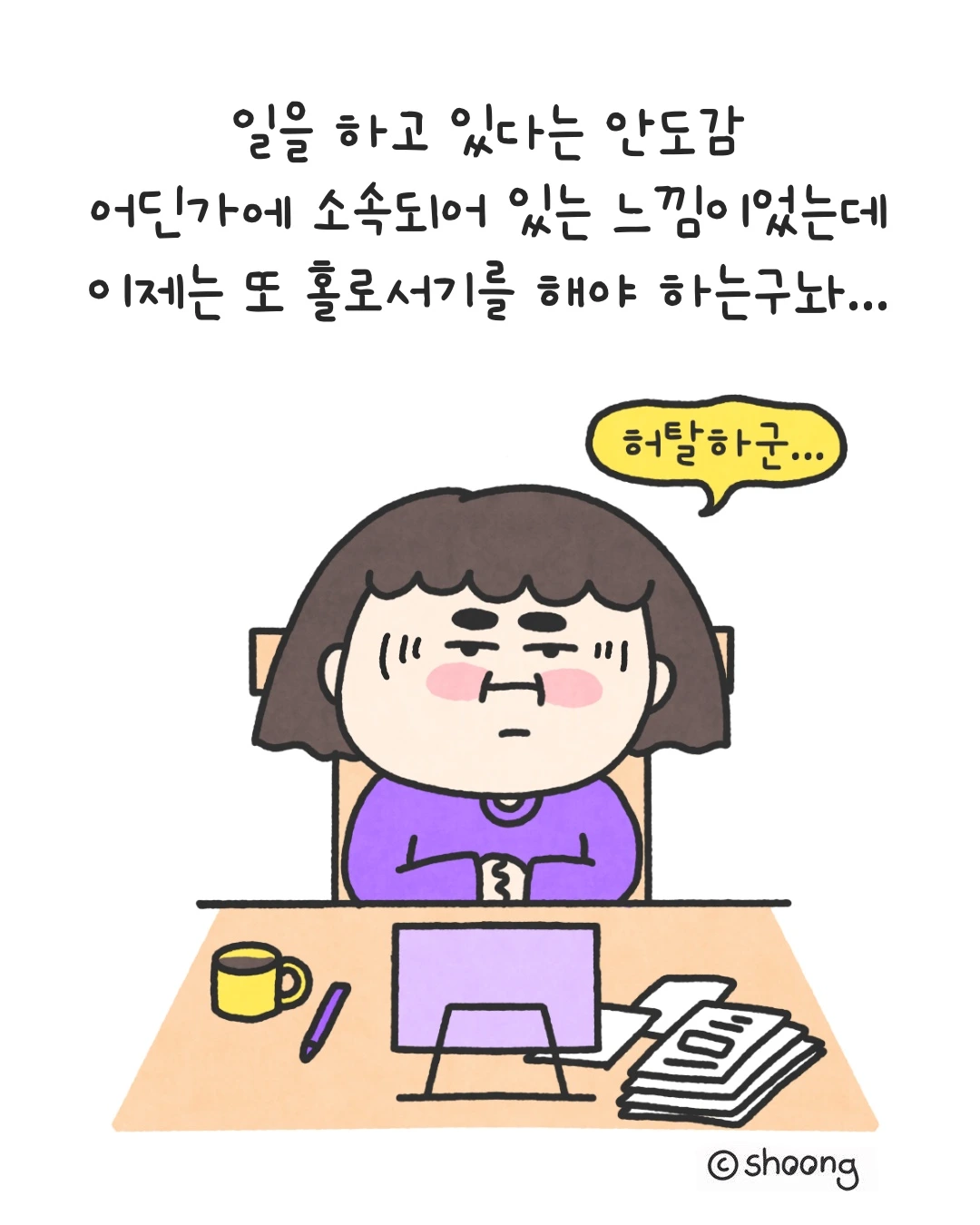 웹디자이너로 20년을 일하고 더 이상은 하고 싶지 않았다. 퇴사 후를 생각해 내가 하고 싶었던 캐릭터를 그리면서 조카들과 있었던 이야기를 그리는 육아툰을 시작으로 일상이 웃픈 내 이야기를 그리는 일상툰, 스트레스받는 직장인들을 위해 대신 질러주는 이야기 직장인툰 세 가지를 그리면서 작업 의뢰가 근근이 들어왔었다.