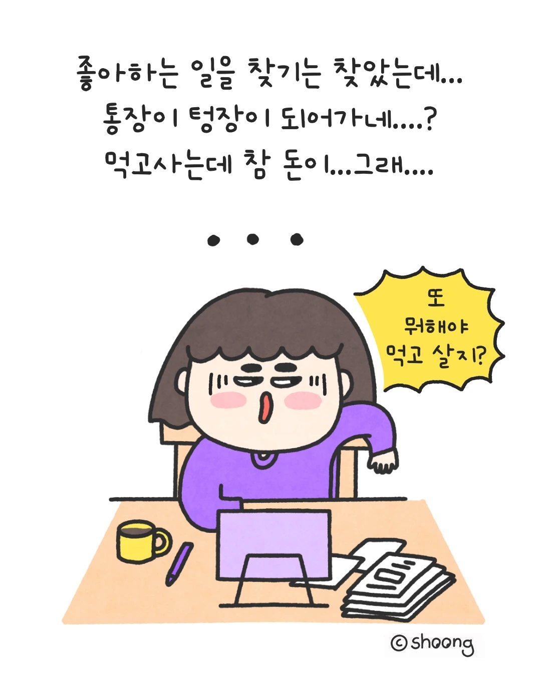 좋아하는 일을 찾은 것 같은데 먹고 살기엔 충분치 않다네... 당장 먹고사는 게 급하다 보니 좋아하는 일보다는 돈을 벌 수 있는 일을 찾게 되는 것 같다.