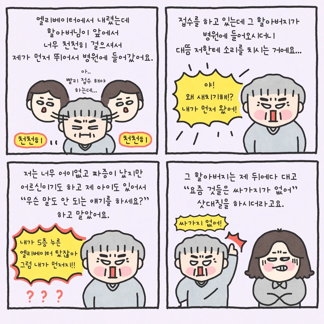 엘리베이터에서 내렸는데 앞서 걷던 할아버님 걸음이 너무 느리셔서 저는 뛰어서 이비인후과에 들어가 접수를 하고 있었어요. 그때 뒤늦게 들어온 할아버지가 제 뒤에서 소리를 지르면서