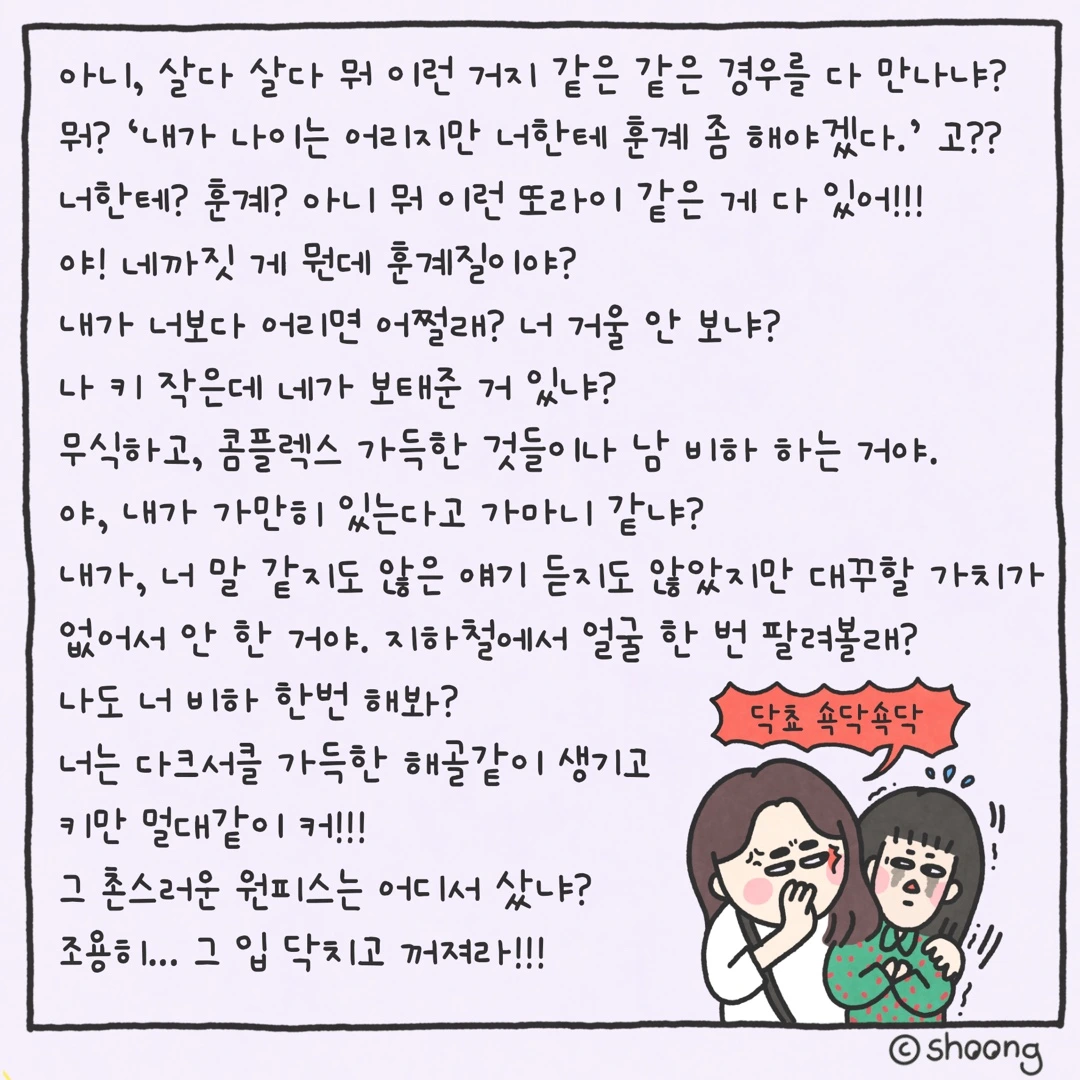 ‘내가 너보다 어리지만 내가 훈계 좀 할게’라는 말이 잊히지 않는 거예요!!! 너무너무너무 짜증 나요!