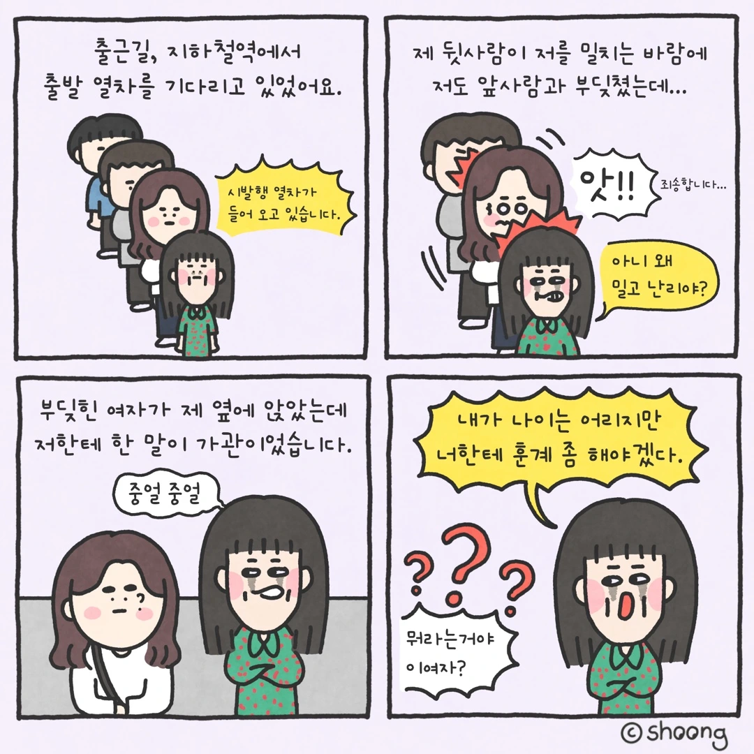 훈계? 훈계? 저는 지금 무슨 소리를 들은 건가 싶고, 너무 어이가 없었지만 그러거나 말거나 내버려 두었는데, 옆에서 계속- 자기가 나보다 나이다 어리다, 훈계 어쩌고 저쩌고 하는 거예요.