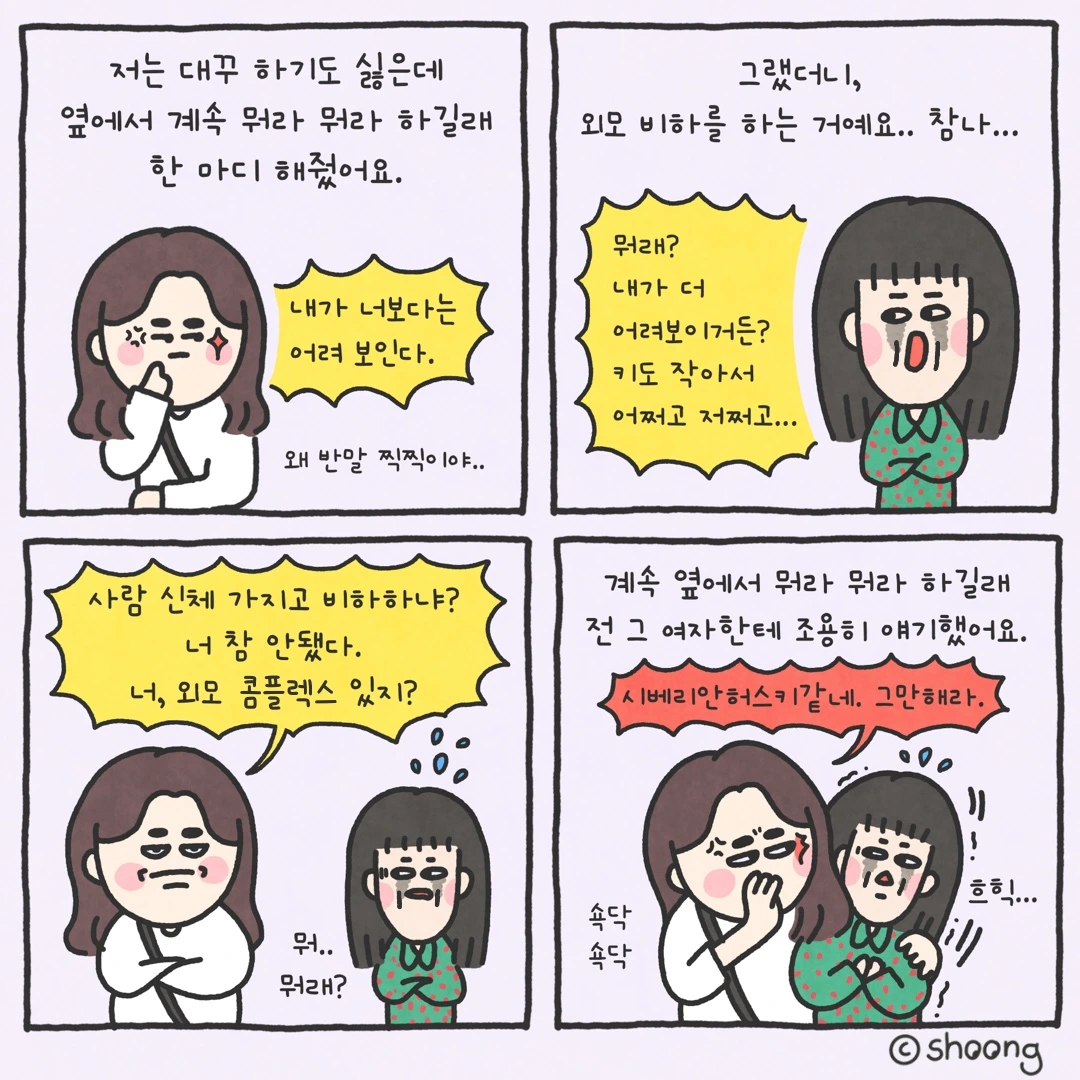“너 어디서 신체 가지고 비하야? 너 되게 불쌍하다. 너 외모 콤플렉스도 있지? “라고 했더니 얼굴이 빨개지면서 뭐라 뭐라 하는데 듣지도 않았어요.
