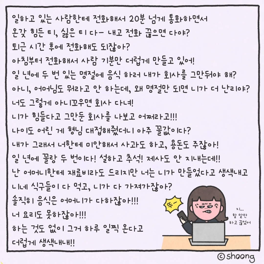 아침부터 전화해서 바쁜 사람 일도 못하게 혼자서 주저리주저리 할 말 다하고 끊어버리고...
