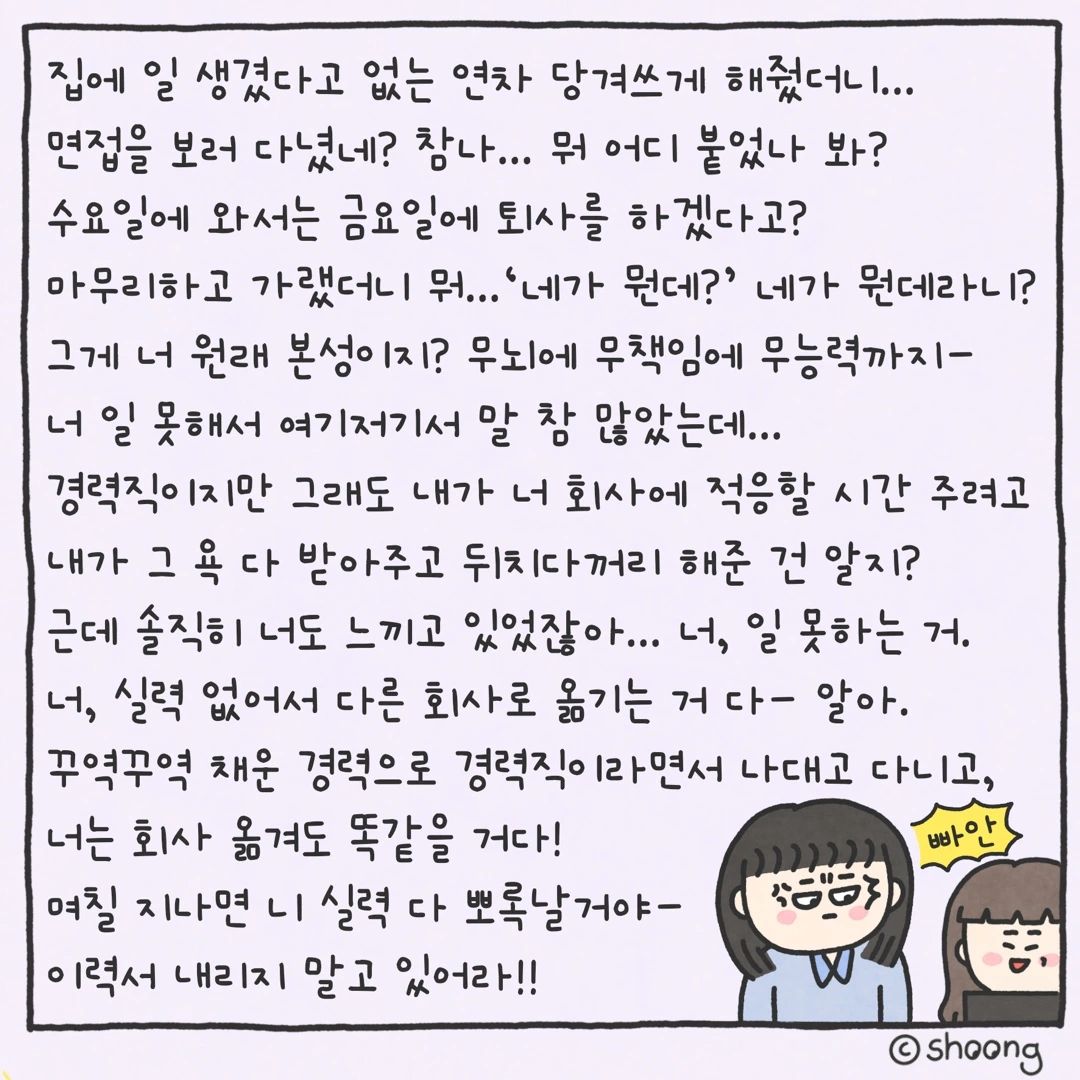 전 정말 그 직원이랑 같이 보낸 한 달이 악몽이었습니다. 회사를 자주 옮긴 이유를 알겠더라고요. 인성도 일도 제대로 된 게 없으니 도망친 거였어요.
