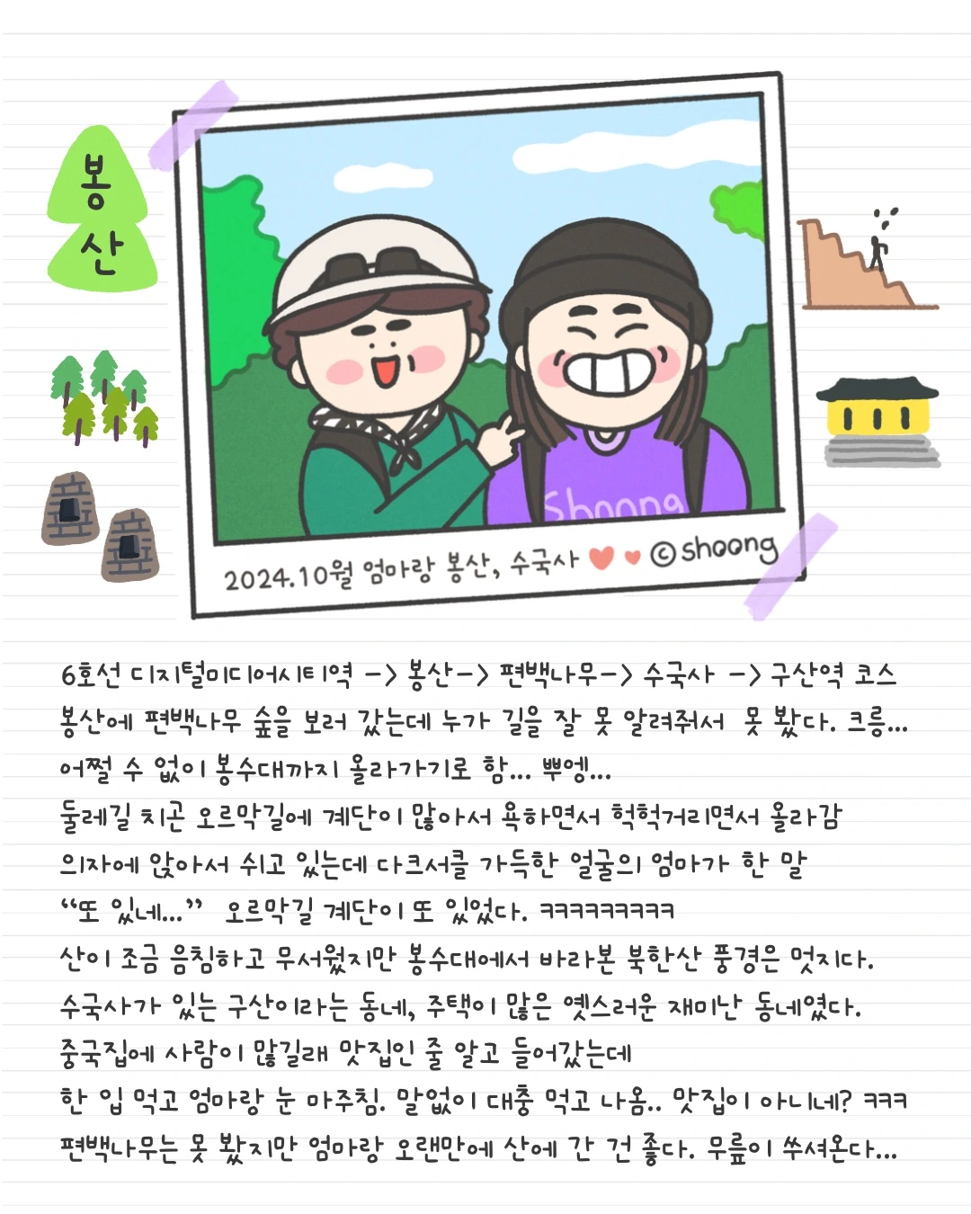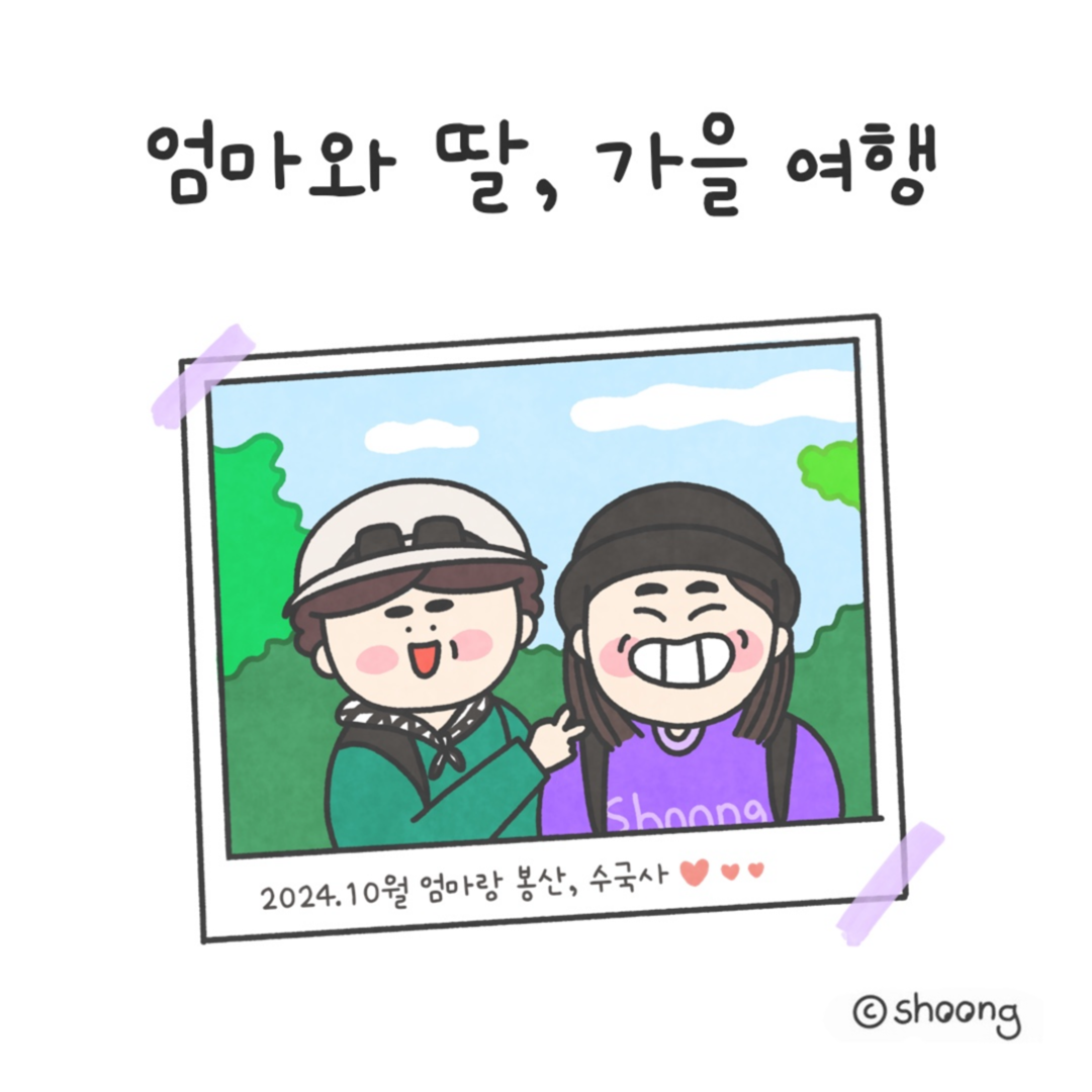 편백나무 숲도 보지 못했고, 계단을 오르락내리락하느냐 무릎도 이프고, 기대했던 중국집도 실패했지만, 엄마와 함께한 하루는 그 모든 걸 덮어줄 만큼 따뜻하고 즐거웠다. 처음 가 본 동네의 낯섦과 조금씩 길을 헤매며 구경한 그 시간이 어느새 여행이 되었다.