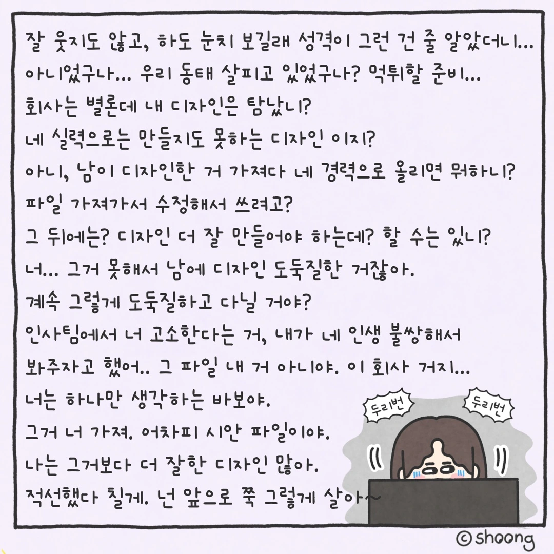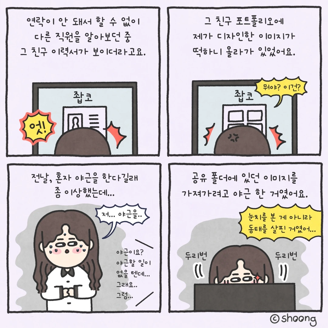 인사팀에서는 고소하자고 난리가 났었지만 저는 어차피 옛날에 디자인한 시안 작업이고, 실력 없는 불쌍한 인간이라 다른데 가도 똑같이 도둑질하다 들킬 거라고 고소한다고 통보는 하고 고소는 하지 않기로 했어요. 아마 겁 좀 먹었을 거예요. 본인도 사회생활이 그렇게 호락호락하지 않다는 걸 알게 됐을 거예요.