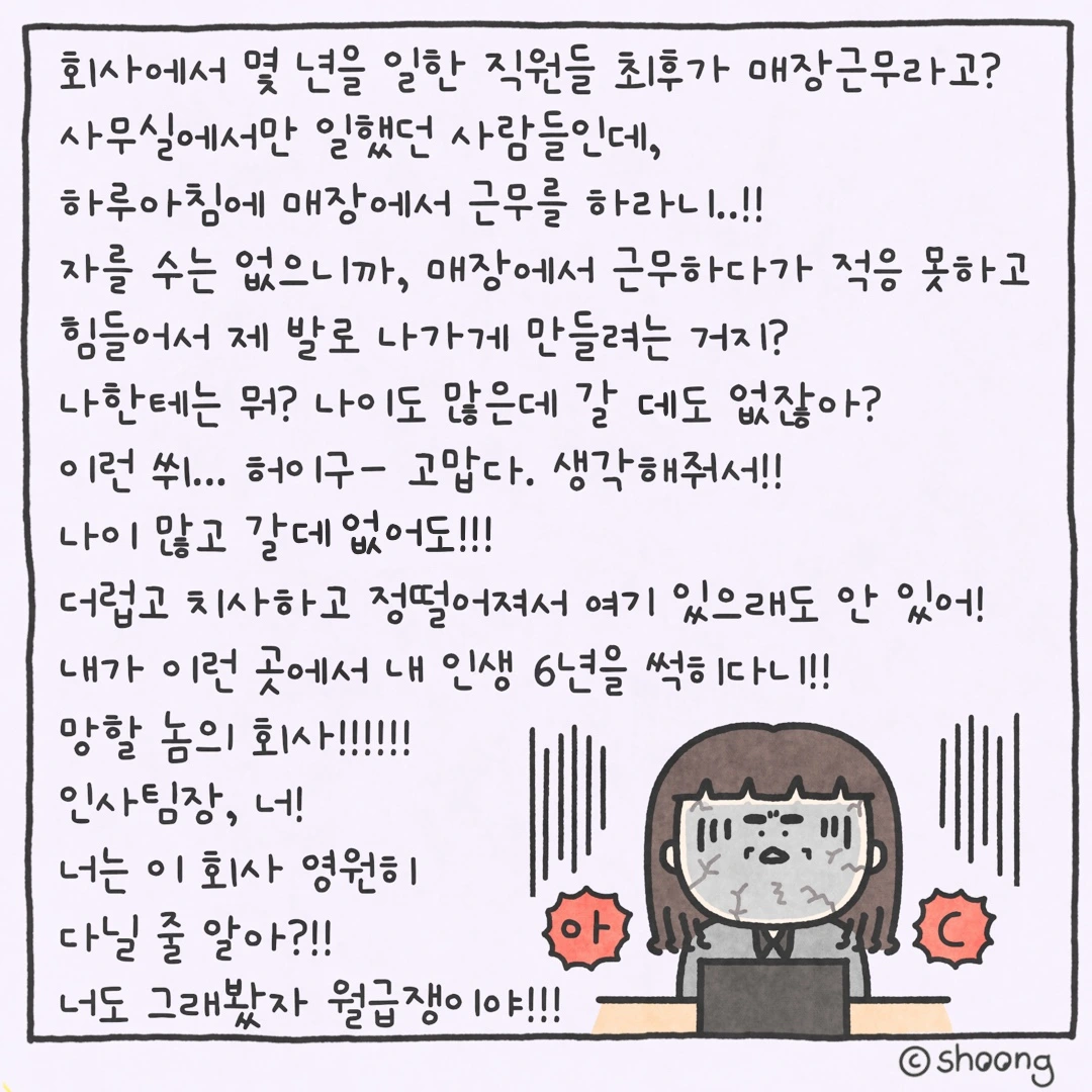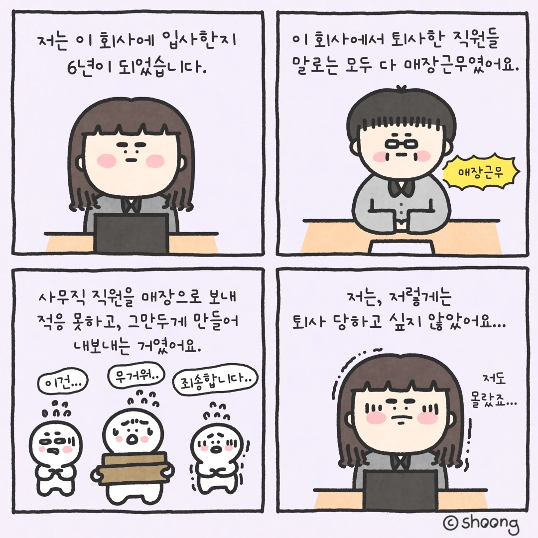타 부서 팀장님이 인사팀에 불려 간 다음 날부터 팀장님이 안 보이셨는데, 매장에서 근무를 하고 계셨어요. 사무실에서만 몇 년을 일하던 분이 매장에서 일을 하려니 적응도 잘 못하고, 힘들어하시더니 결국 퇴사를 하셨어요.