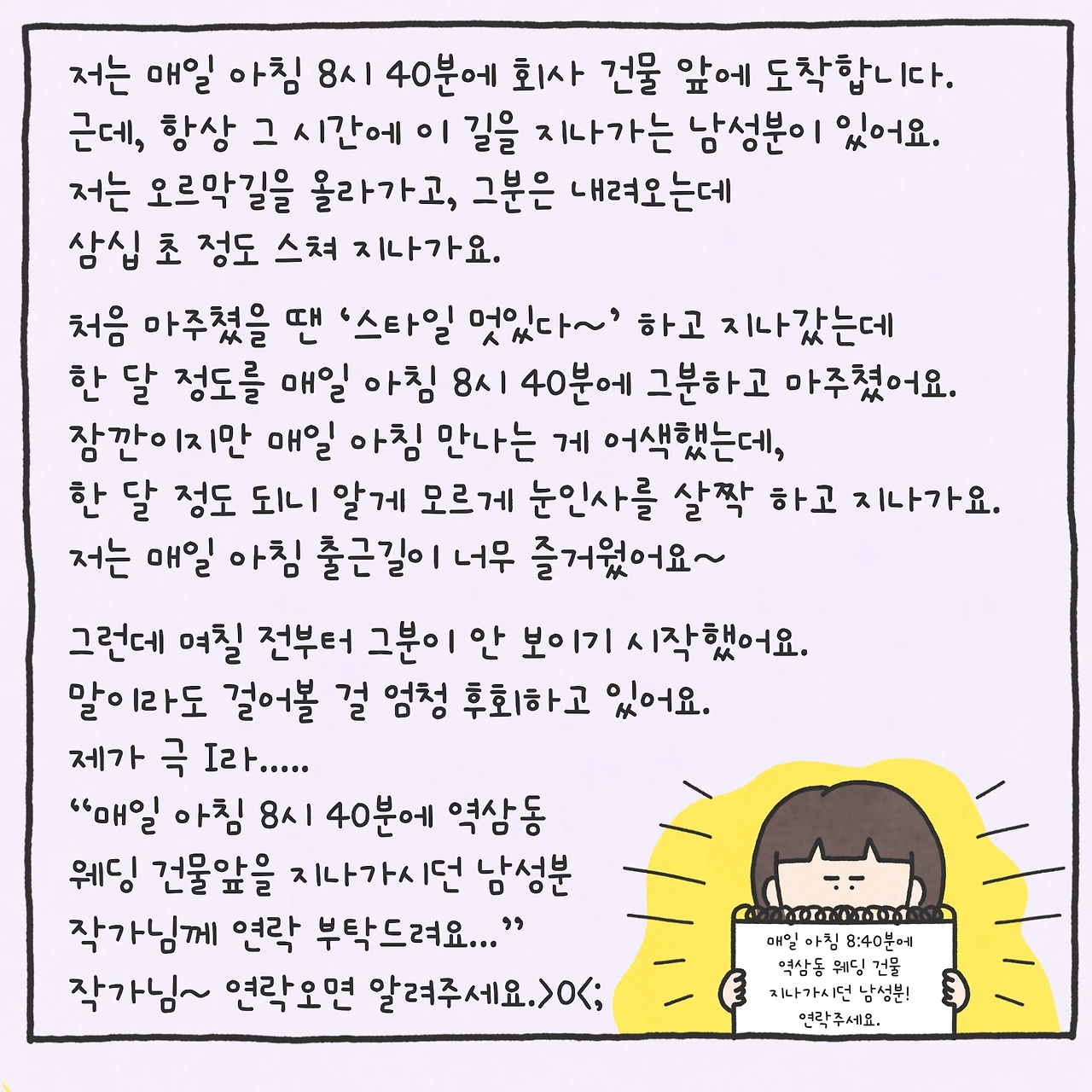 한 달 정도 매일 아침 8시 40분에 마주치다 보니 어색하지만 눈인사를 하고 지나가게 됐어요.