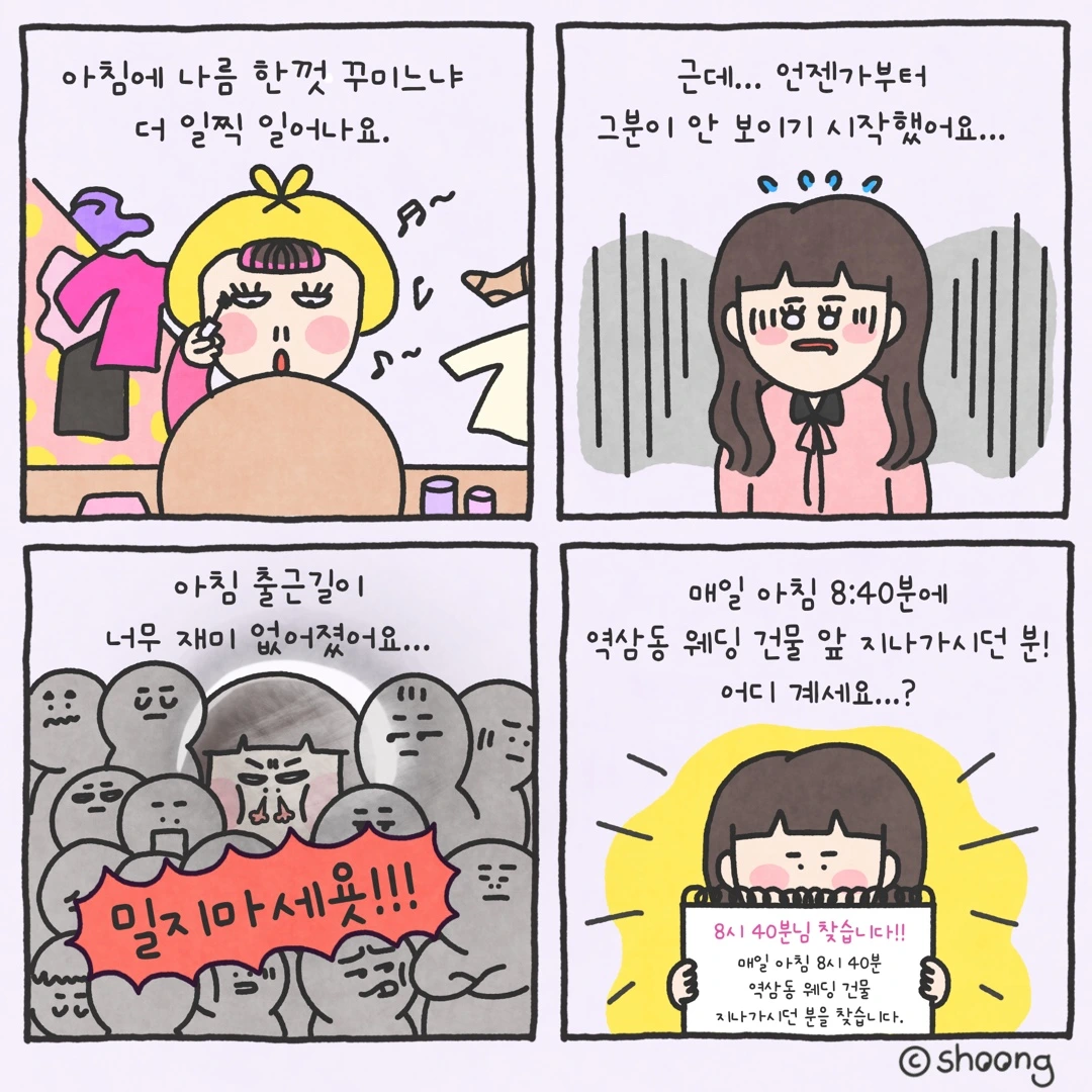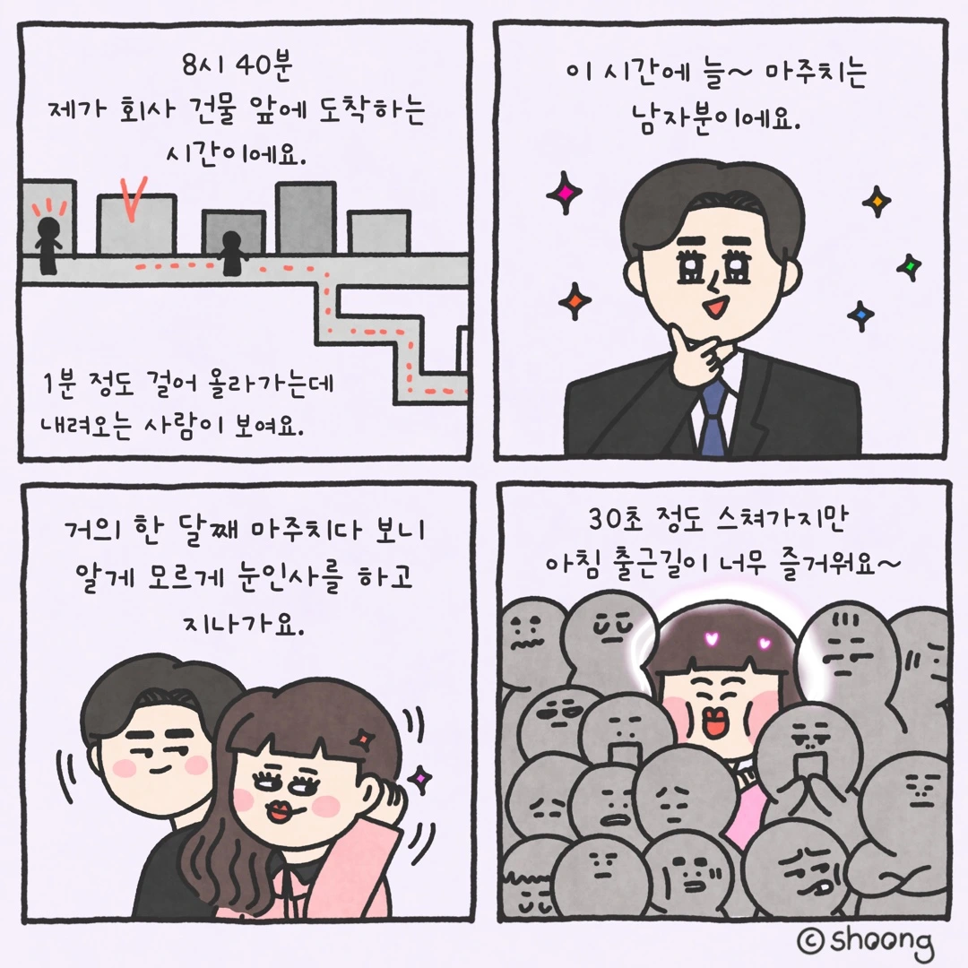 혹시나 혹시나 또 만날까 기대하면서 매일 아침 일찍 일어나 즐겁게 출근 준비를 하고, 지옥철 안에서도 즐거웠어요.