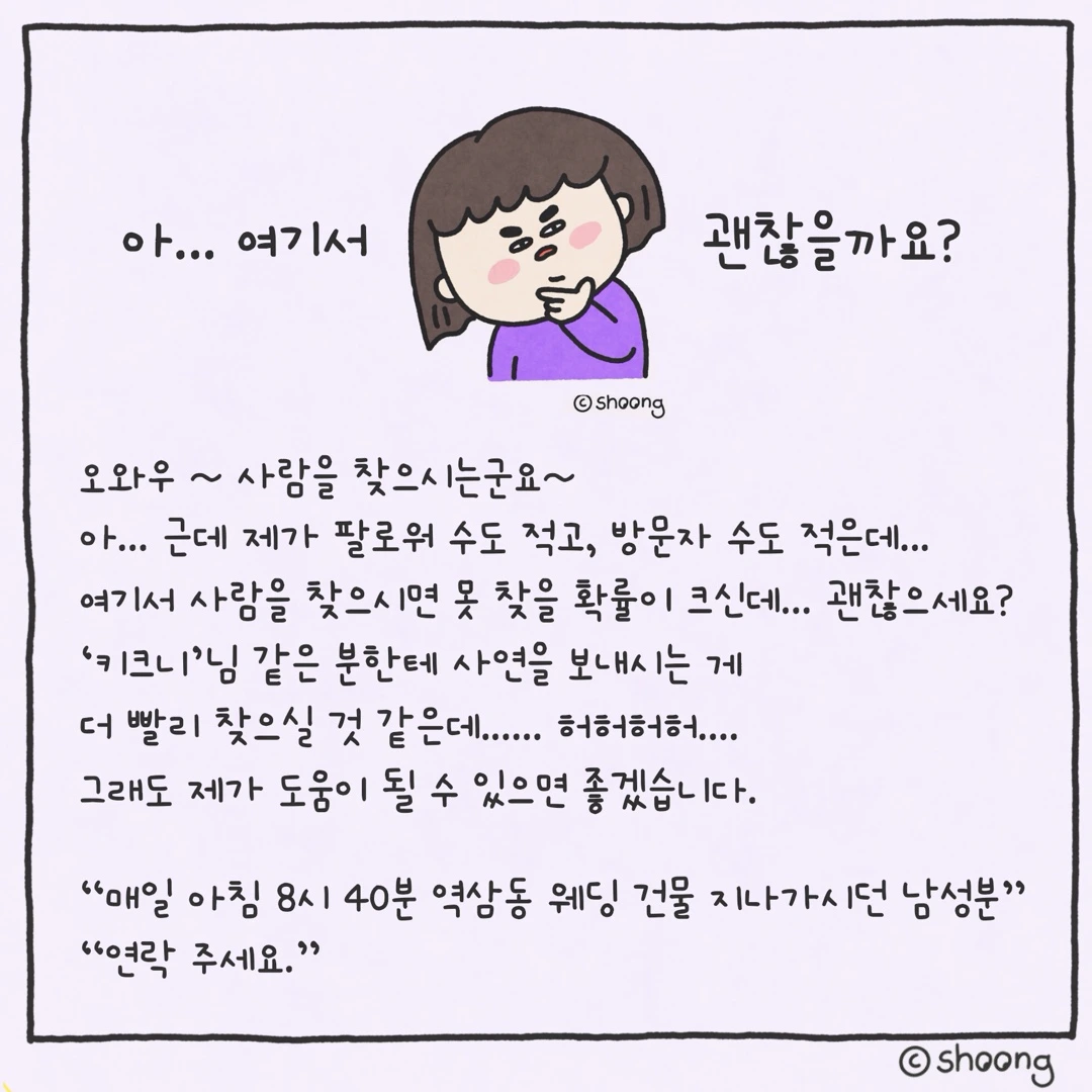 제가 팔로워 수도 적고, 방문자 수도 그렇게 많지 않아서 여기서 그분을 찾기는 좀 힘들 것 같은데 괜찮으실까요?