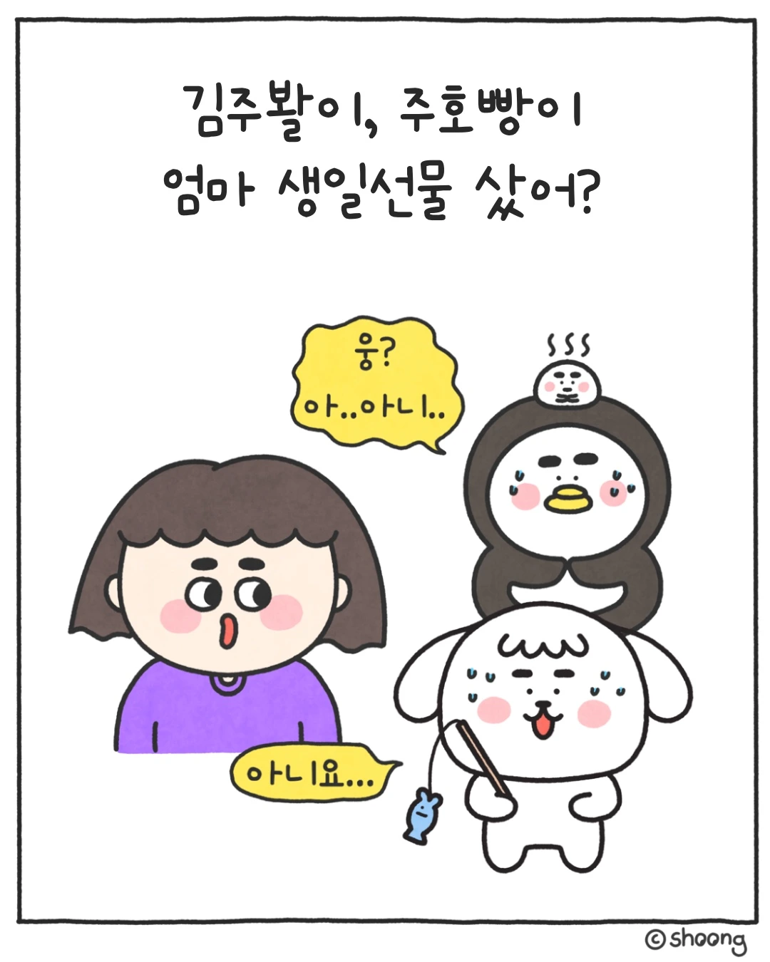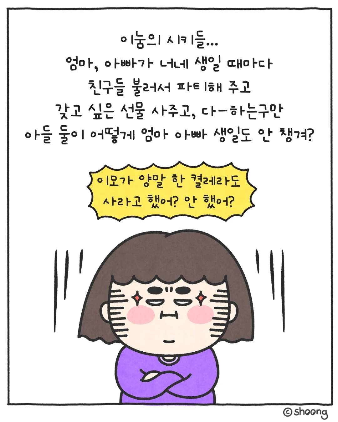 “이 눔의 시키들... 엄마 아빠는 너네 생일에 친구들 불러서 생일파티도 해주고, 생일선물도 갖고 싶은 거 다 사주는데 너네는 엄마 아빠 생일 챙기지도 않아? 이모가 양말 한 짝이라도 사라고 했어 안 했어? “