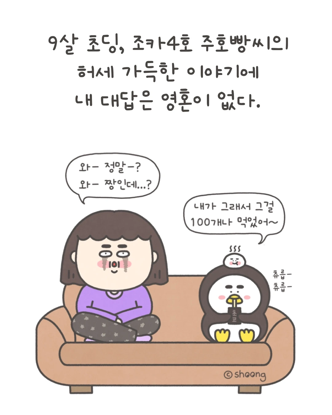 초코우유를 마시며 허세를 부리는 주호빵 씨에게 나는 영혼 없는 리액션을 던진다.