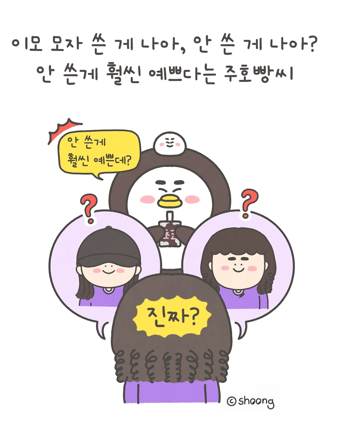 내친김에 하나 더 물었다. “이모 모자 쓴 게 나아, 안 쓴 게 나아?”