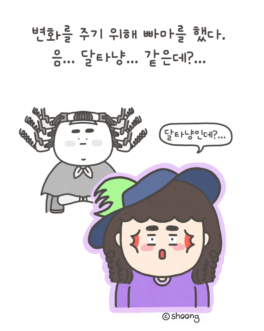 주호빵 씨에게 어색하게 웃으며 물었다. “이모 파마했어. 어때?”