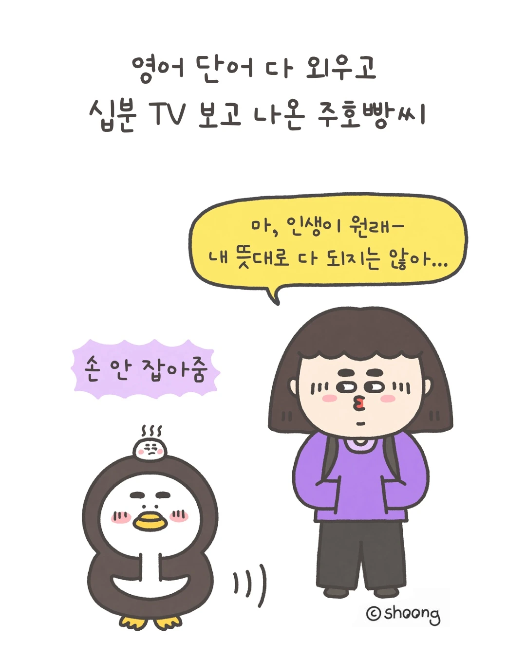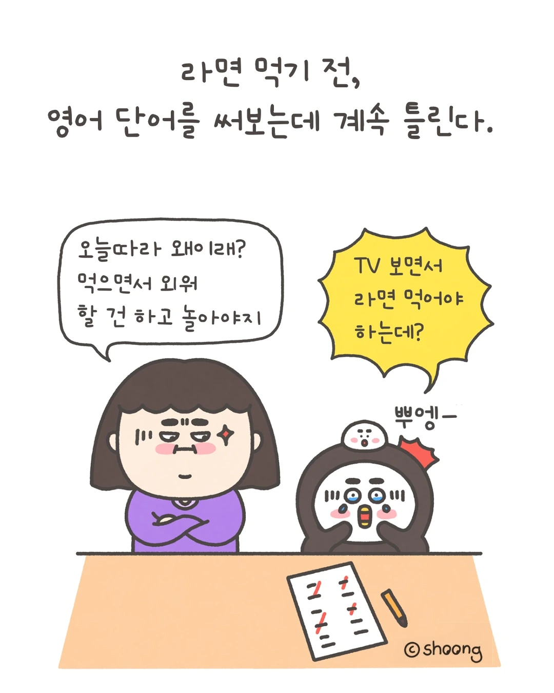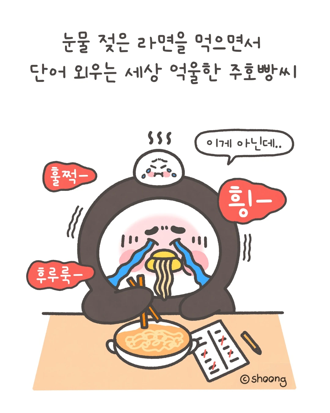 눈물 젖은 라면을 먹으면서 단어를 외우는 주호빵씨.