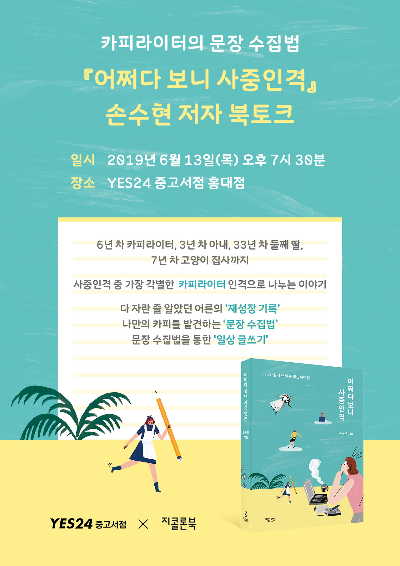 저녁 일정을 잡기에 부담 없는 목요일. 별거 아니라고 생각했던 메모가 책 한 권이 되기까지의 과정을 차근차근 들려드릴까 해요. 때론 카피라이터로, 때론 에세이 작가로 살고 있는 모든 날들에 대해서요. 여러분은 가벼운 발걸음만 챙겨 오시면 됩니다 :)