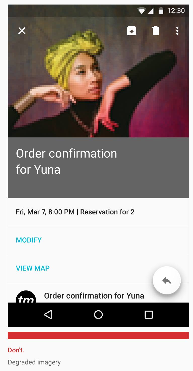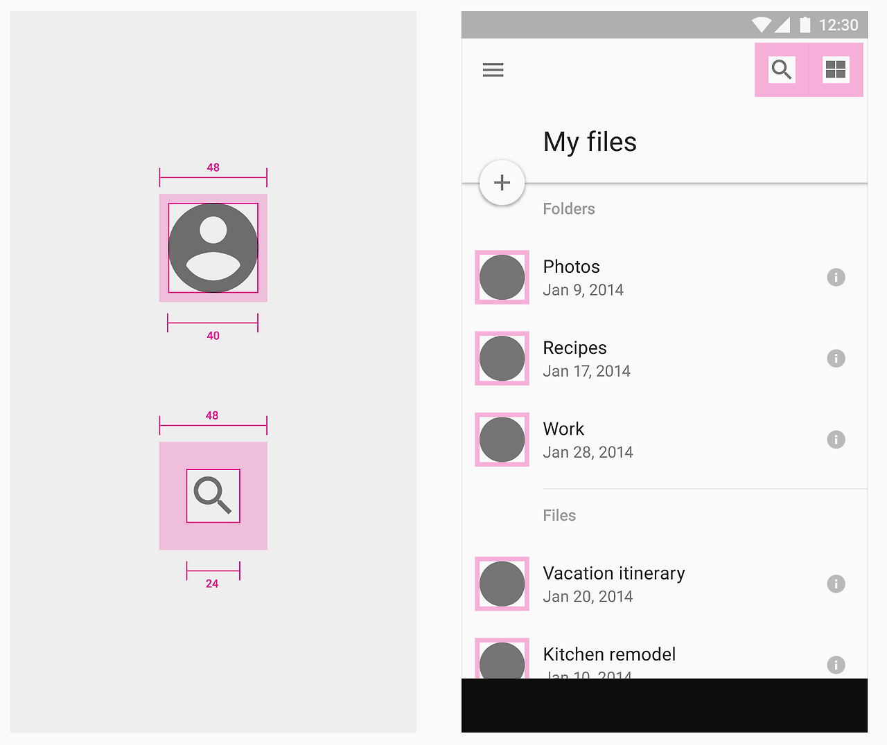시력이 안 좋거나 손에 문제가 있는 사람들에게는 너무 작은 터치영역은 큰 불편함을 줄 수 있으니 아이콘이 크기가 작더라도 터치 영역은 최소 48x48 dp를 유지하라고 권장한다.