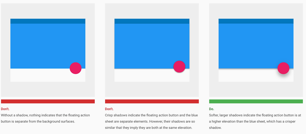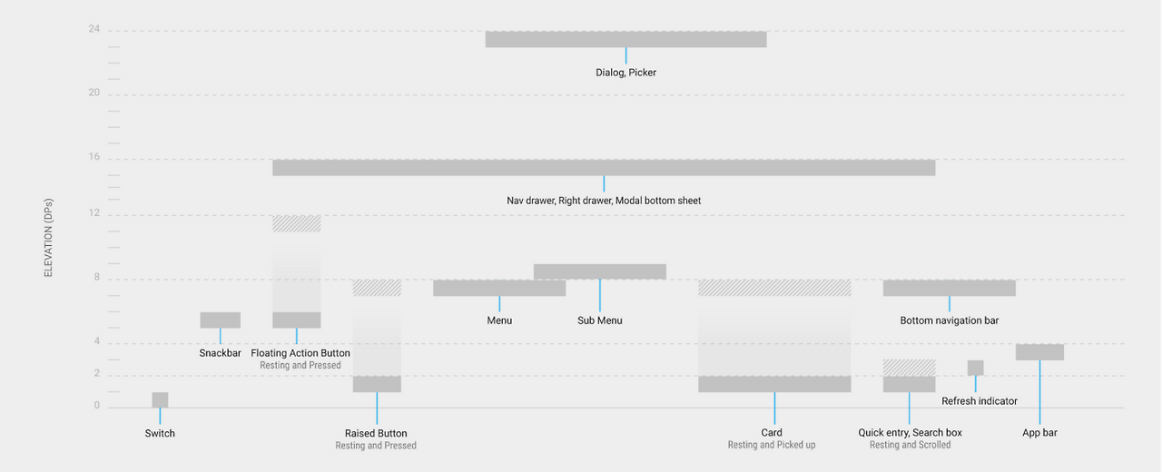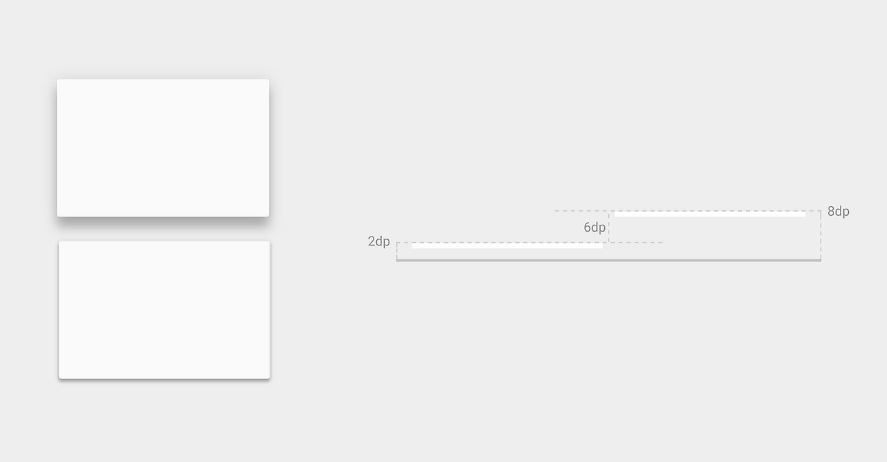 상단 앱 바는 4dp 높이에, 오른쪽 하단에 있는 플로팅 버튼은 6dp높이에 있다. 하단에 내비게이션 바가 있을 경우 하단 내비게이션 바는 8dp..