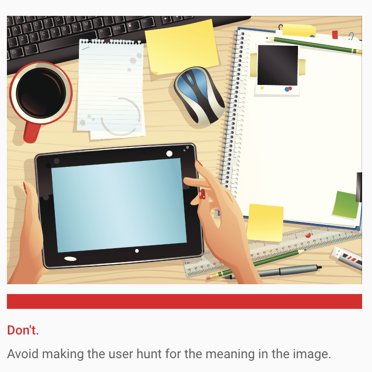 Avoid making the user hunt for the meaning in the image. 사용자가 이미지의 의미를 사냥하도록(.. 찾도록) 만들지 마라.