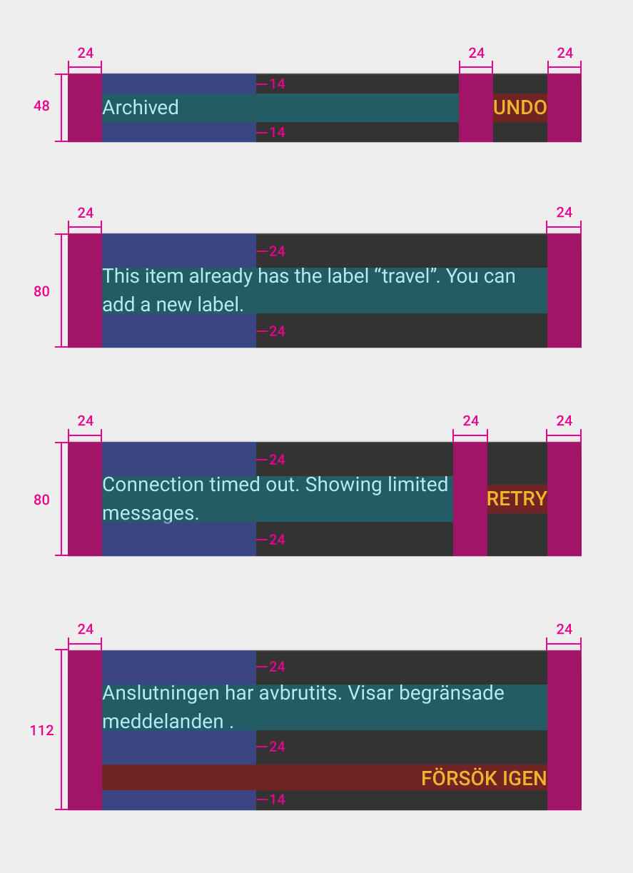스낵바 스펙 안내에는 아래 처럼 텍스트가 한 줄 일 때 가이드와 두 줄 일 때, 액션 버튼이 텍스트 오른쪽에 위치하는 경우와 하단에 위치하는 경우도 나눠서 제시한다.