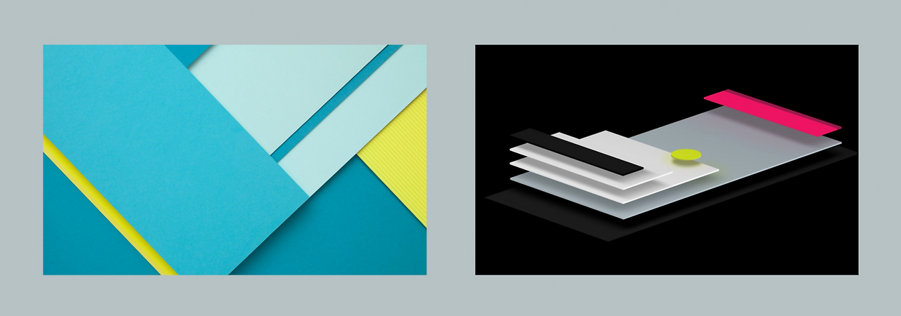머티리얼 디자인은 이런 느낌이다. 종이를 여러 장 잘라서 올린 모습을 상상하면 된다. flat 디자인이 다 같이 플랫플랫(?)해서 경계 구분이 모호했다면 Material은 이름대로 재료들이 저렇게 제 높이에 올라가 있어서 음영의 깊이를 표현하고 기능과 영역을 구분한다.