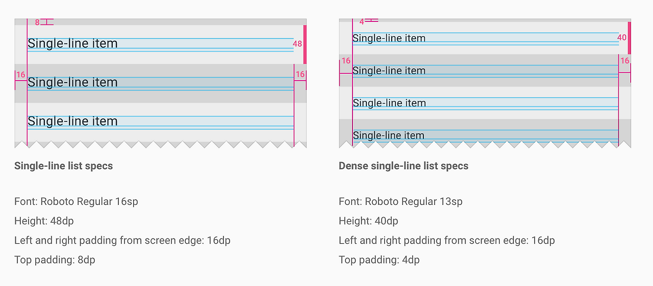 스펙을 훑어보면 4와 8의 배수가 익숙하게 자주 쓰인다. 리스트 간 간격 4dp 혹은 8dp, 리스트 양쪽 마진 16dp, 버튼 양쪽 마진 16dp, 텍스트 필드 위아래 패딩 16dp, 버튼 높이 36dp, 리스트 세로 높이 48dp, 텍스트 필드 높이 48dp... 외우고 있다는 게 아니고 익숙한 숫자가 높이, 마진, 패딩에 쓰인다. 22, 23 같은 숫자는 없다.