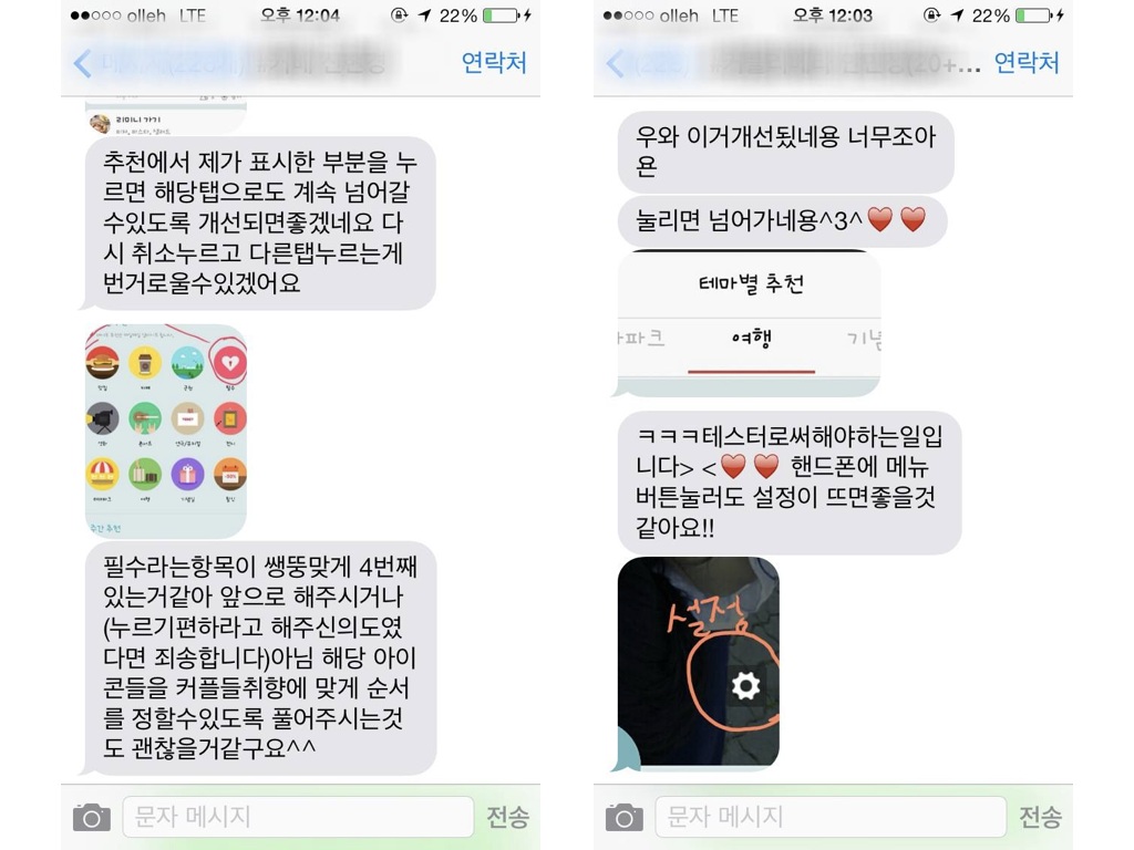 평소 사용하는 번호로 버그 제보와 의견을 주고받았는데 정말 많은 문자들이 오갔다. 별 보상도 없는 일에 이렇게까지 의견을 주는 것은 감동이었다.